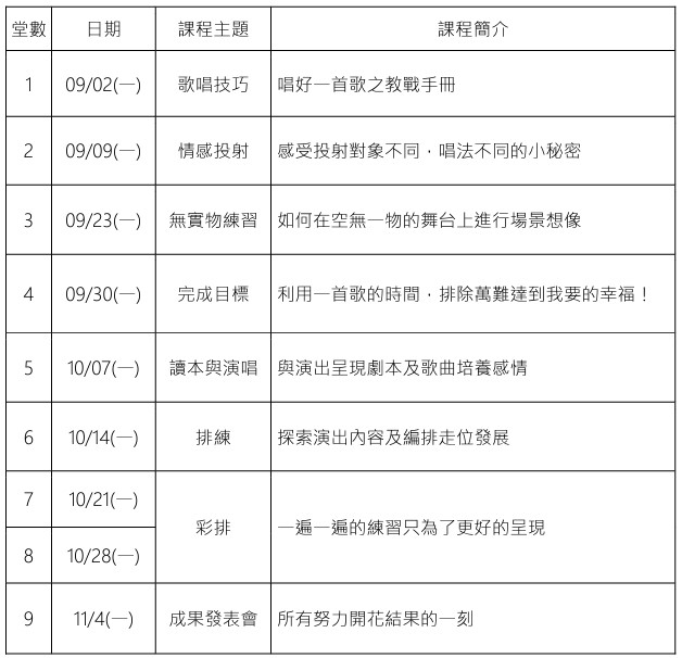 - 本工作坊共9堂課含1場成果發表 ,恕不單堂分售;課堂如需請假請提前告知,不另行退費。
