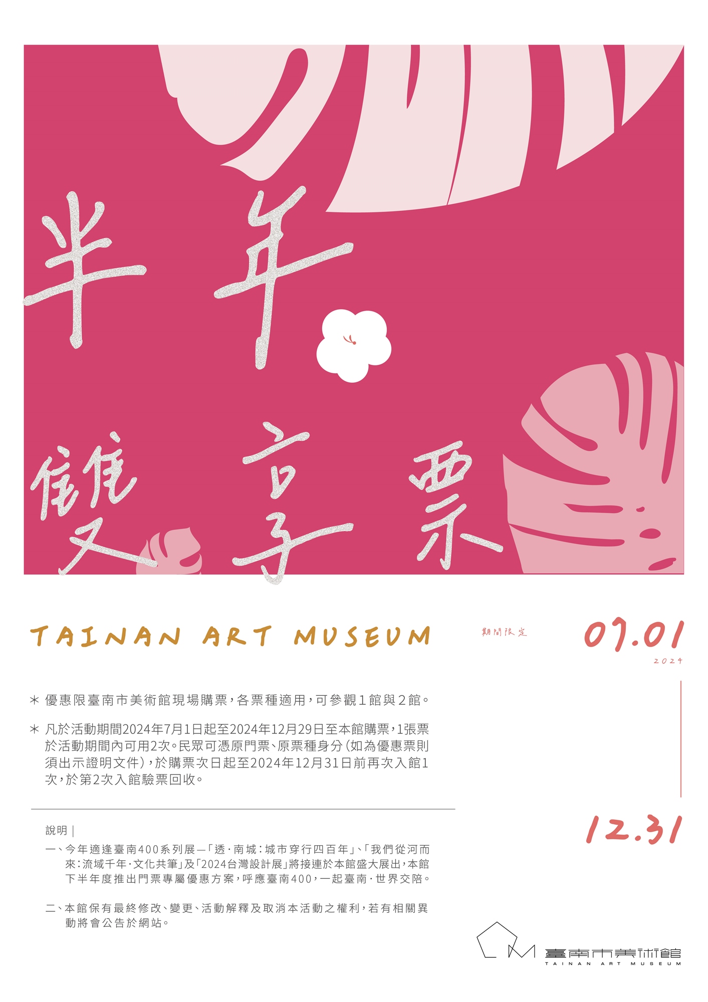 - 今年適逢臺南400系列展—「透.南城:城市穿行四百年」、「我們從河而來:流域千年.文化共筆」及「2024台灣設計展」將接連於本館盛大展出,本館下半年度推出門票專屬優惠方案,呼應臺南400,一起臺南.世界交陪。