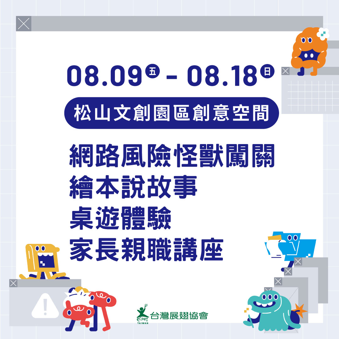 2024年是台灣展翅協會成立30周年,也是兒童權利公約35周年,為了讓更多人認識兒童人權與網路兒少性剝削, 展翅將於8/9-8/18於松山文創園區舉辦特展,透過特展闖關、家長親職講座、繪本說故事與桌遊體驗,讓大眾了解展翅協會在推動兒童人權及防制兒少性剝削的努力,也將數位世界中的風險融入在特展中,以防制網路兒少性剝削為目標,透過特展活動讓大眾認識網路風險並加以預防,幫助台灣的兒童增進數位與網路安全知識。