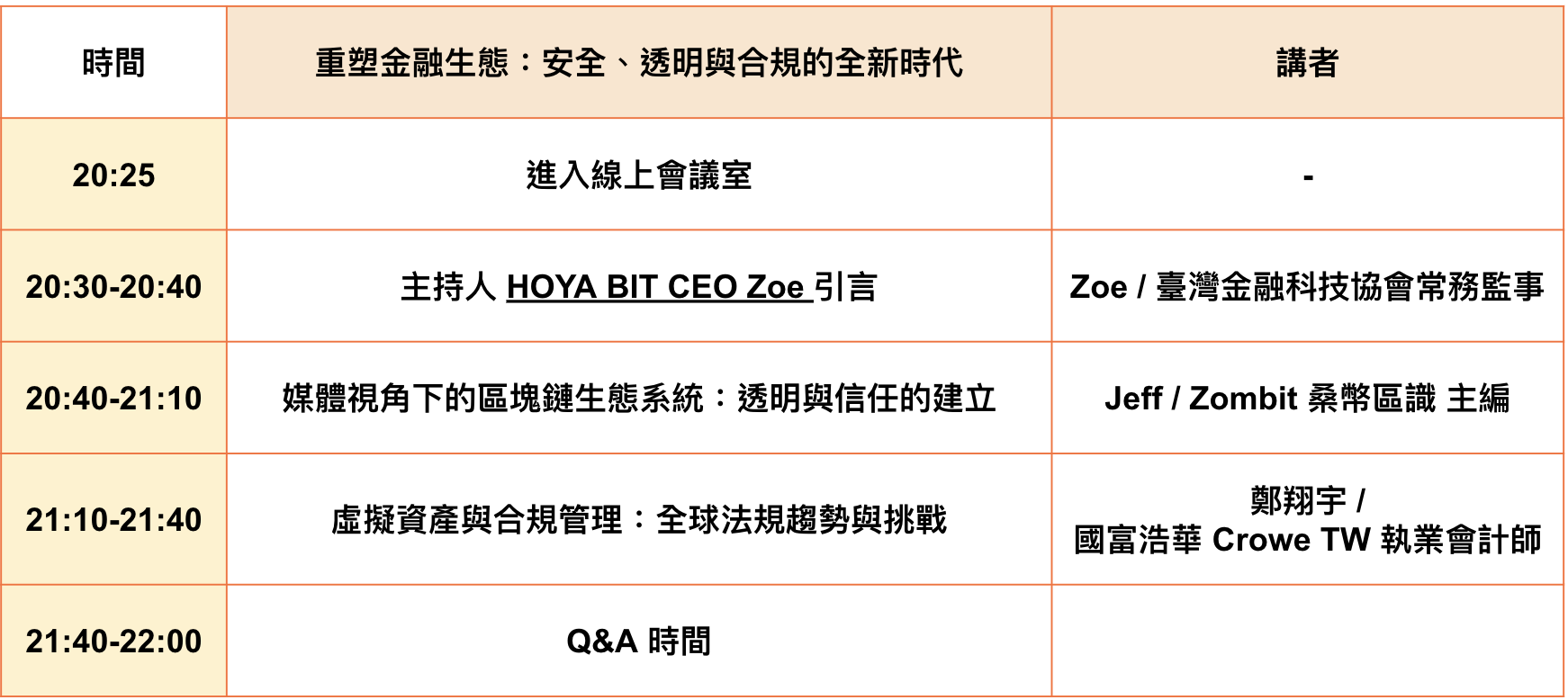 本次活動由臺灣金融科技協會常務監事的 HOYA BIT CEO Zoe 擔任主持人,與產業菁英代表們 Zombit 桑幣區識與國富浩華 Crowe TW 共同探討如何在新的時代背景下重塑金融生態系統,實現安全、透明與合規的全新未來。