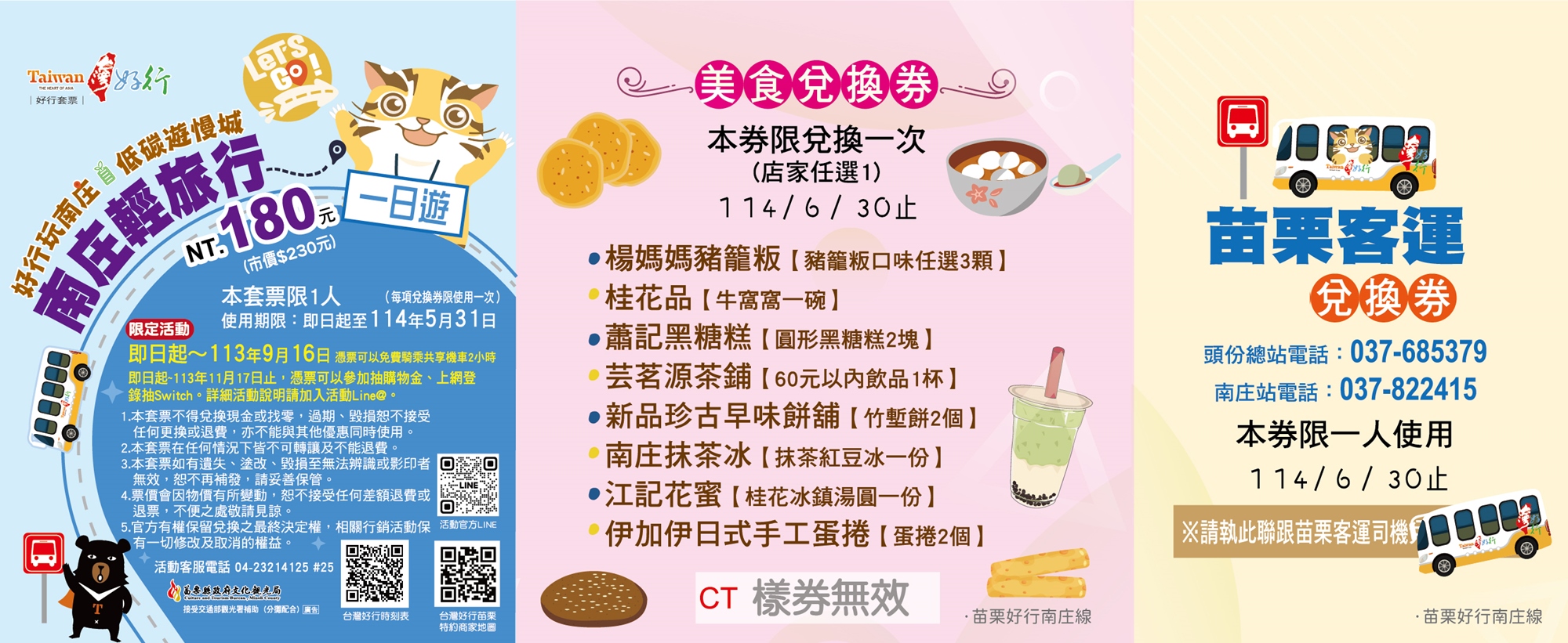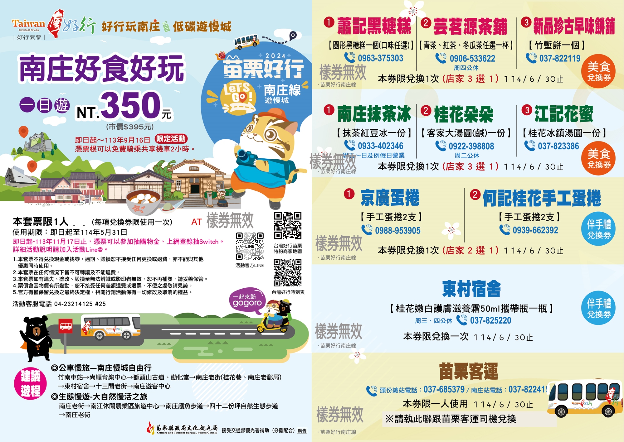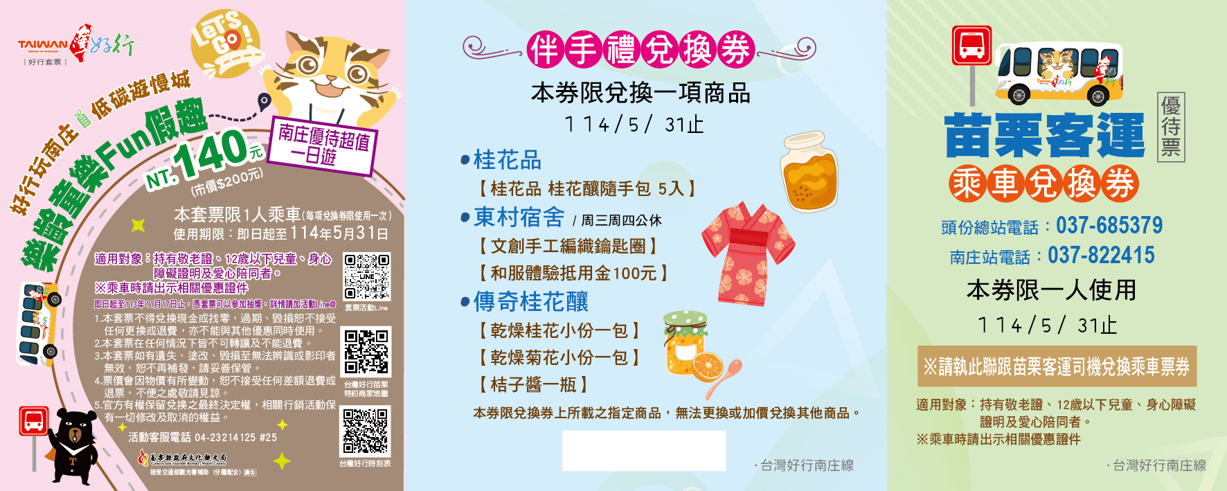 活動說明:憑台灣好行【南庄線】票根,可至特約商店享優惠好康,詳細特約商店請見官網公告。