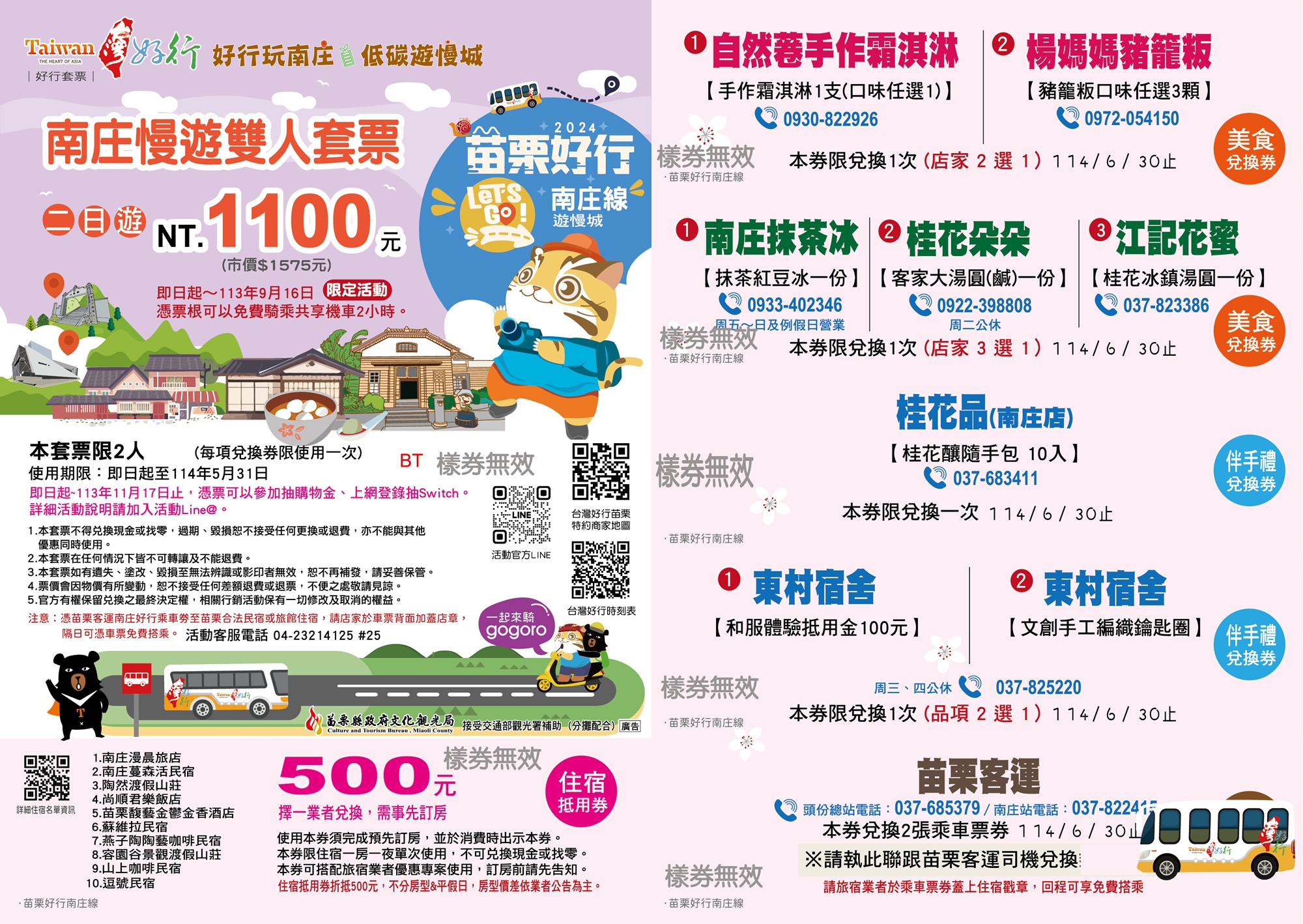套票3|南庄慢城雙人套票(二日遊)市價$1670 優惠價$1100
