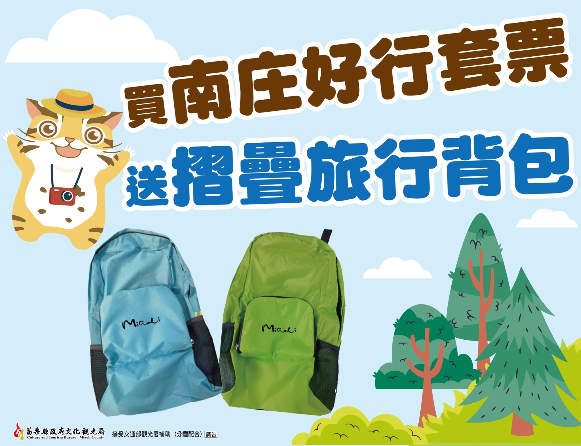 活動說明:10月開始購買南庄線任一套票送摺疊旅行背包(限量150份,送完為止)