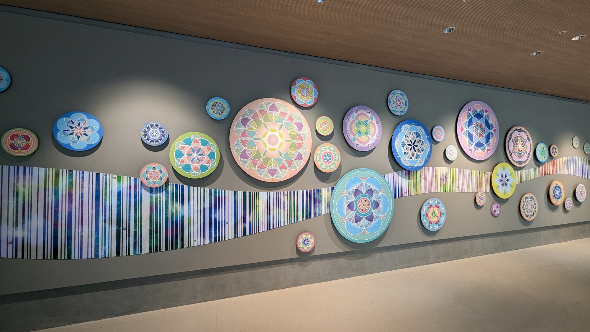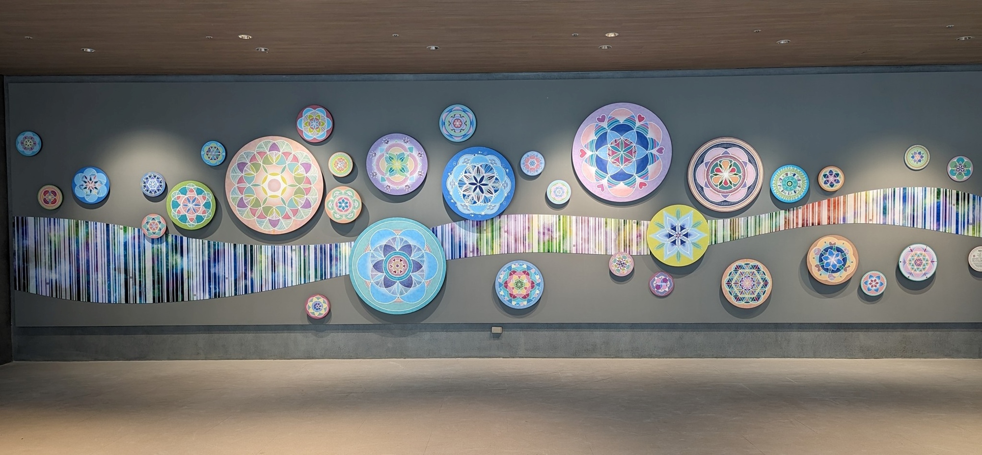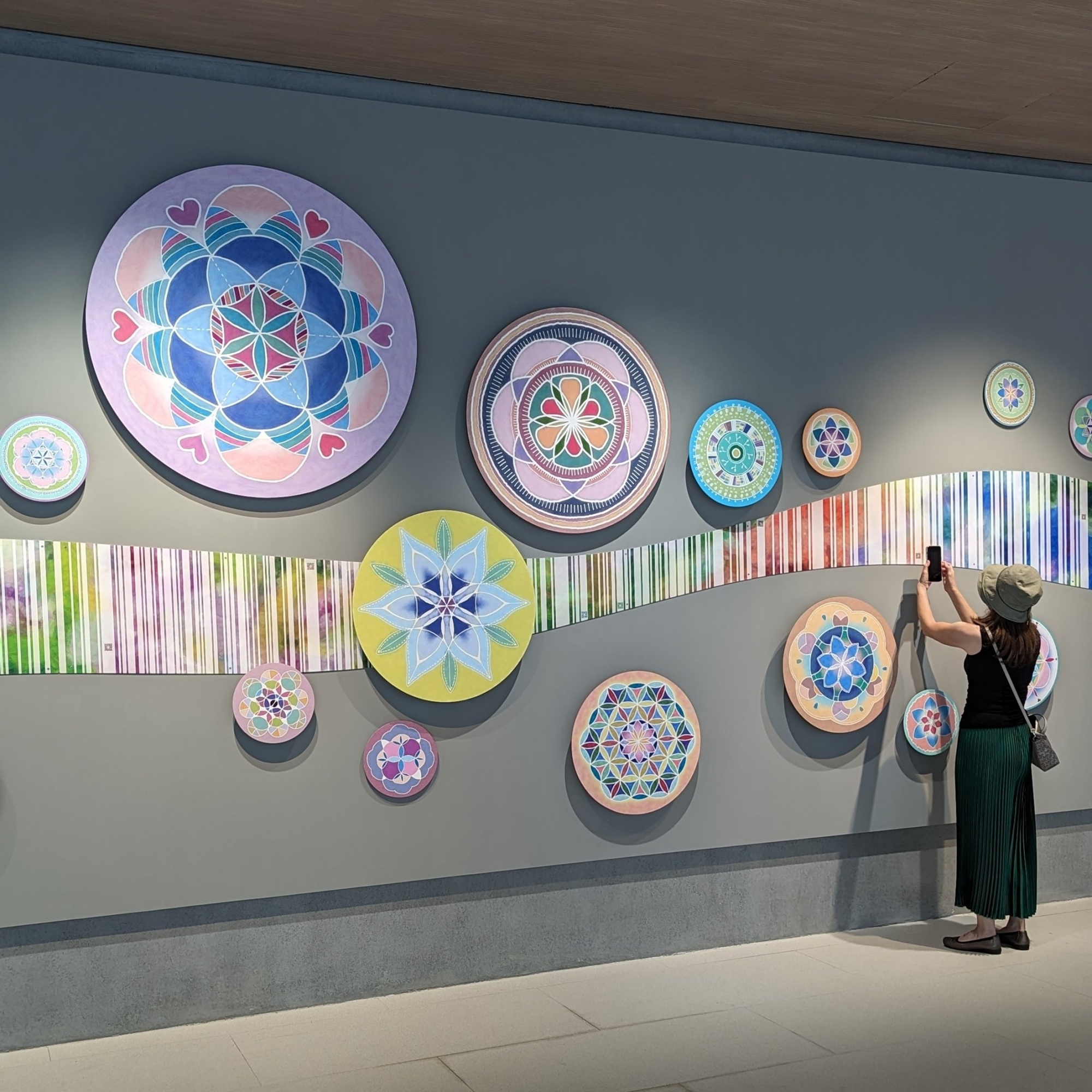 《能量花園》:曾多次榮獲文化部公共藝術民眾參與獎及教育推廣獎之藝術家黃浩德,特別透過工作坊,帶領民眾繪製曼陀羅,靜心、專注、摒除雜念、沉澱心靈,展開自我對話,並將成果融入作品之中,共同完成總寬達20公尺的巨幅作品--《能量花園》。作品中出現的條碼及QRcode,為特殊「能量密碼」,隱藏著透過徵文、參與而來的「能量小語」、「祝福關鍵字」,匯聚眾人滿滿的正面能量,等著每一位來訪旅人尋找出內心的答案與共鳴!