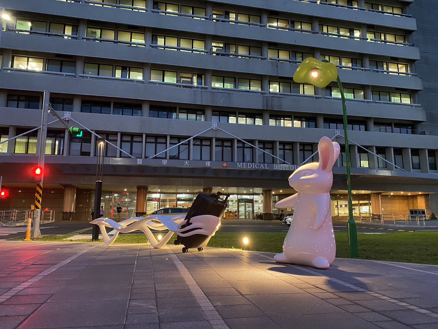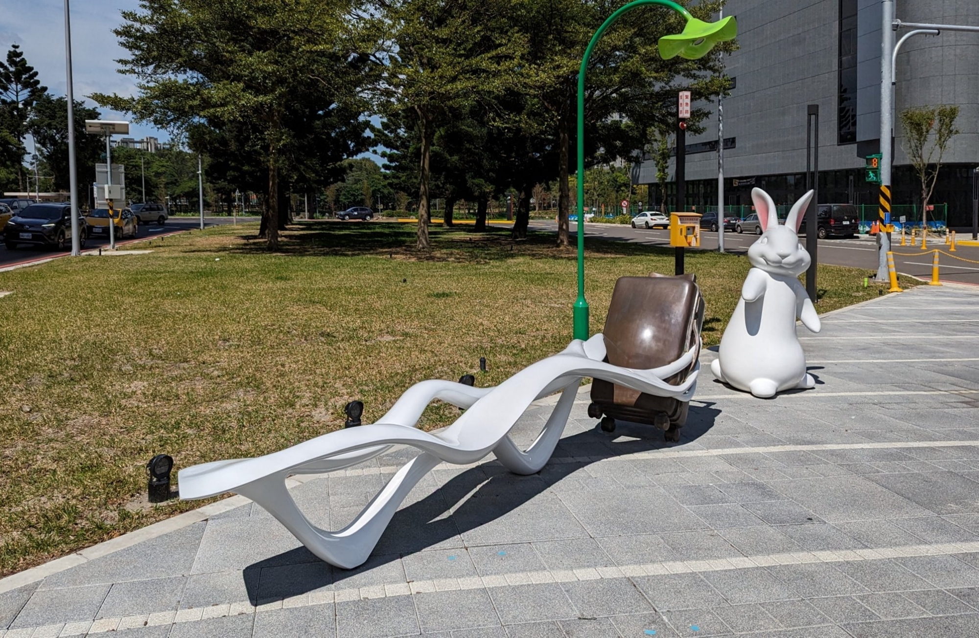 《幸福旅行者》:可愛的兔子帶著行李箱要去旅行,如風吹動的飄帶,讓行李箱充滿了動感,但這時行李箱卻慢下腳步,彷彿在告訴兔子腳步別跑得那麼快。藝術家姜憲明創作的《幸福旅行者》有著吸睛的造型,更結合街道座椅功能,就像在告訴現代人慢下生活步調,坐下來歇一歇,養足了精神,才能成為幸福的旅行者。