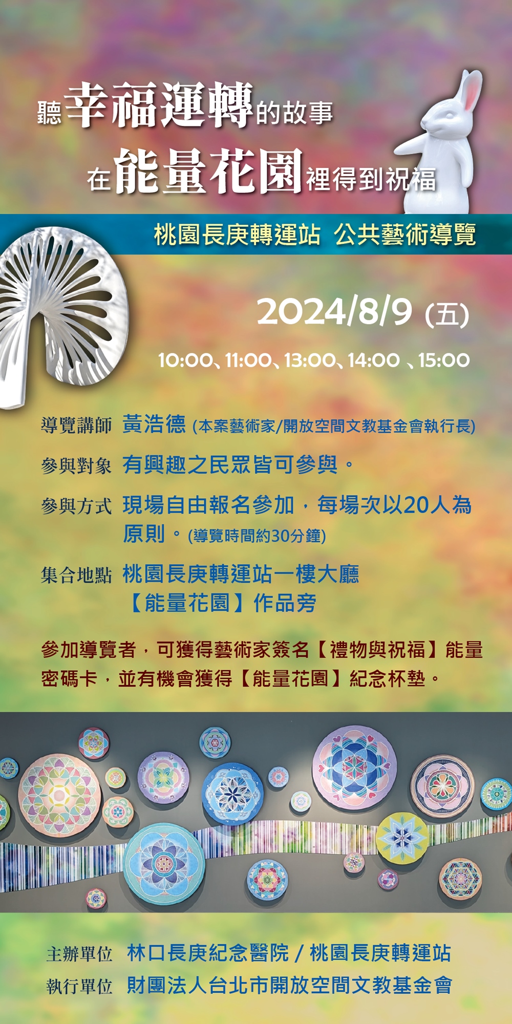 幸福運轉公共藝術計劃,包含《能量花園》、《幸福之輪》、《幸福旅行者》三件作品,期待透過藝術的力量,為旅人的轉運日常增添活潑氛圍及療癒正能量,其中《能量花園》作品融合了由藝術家黃浩德多年來引導民眾繪製曼陀羅進行後製之曼陀羅,匯聚眾人滿滿的療癒能量,將療癒正能量發揮更大影嚮力。