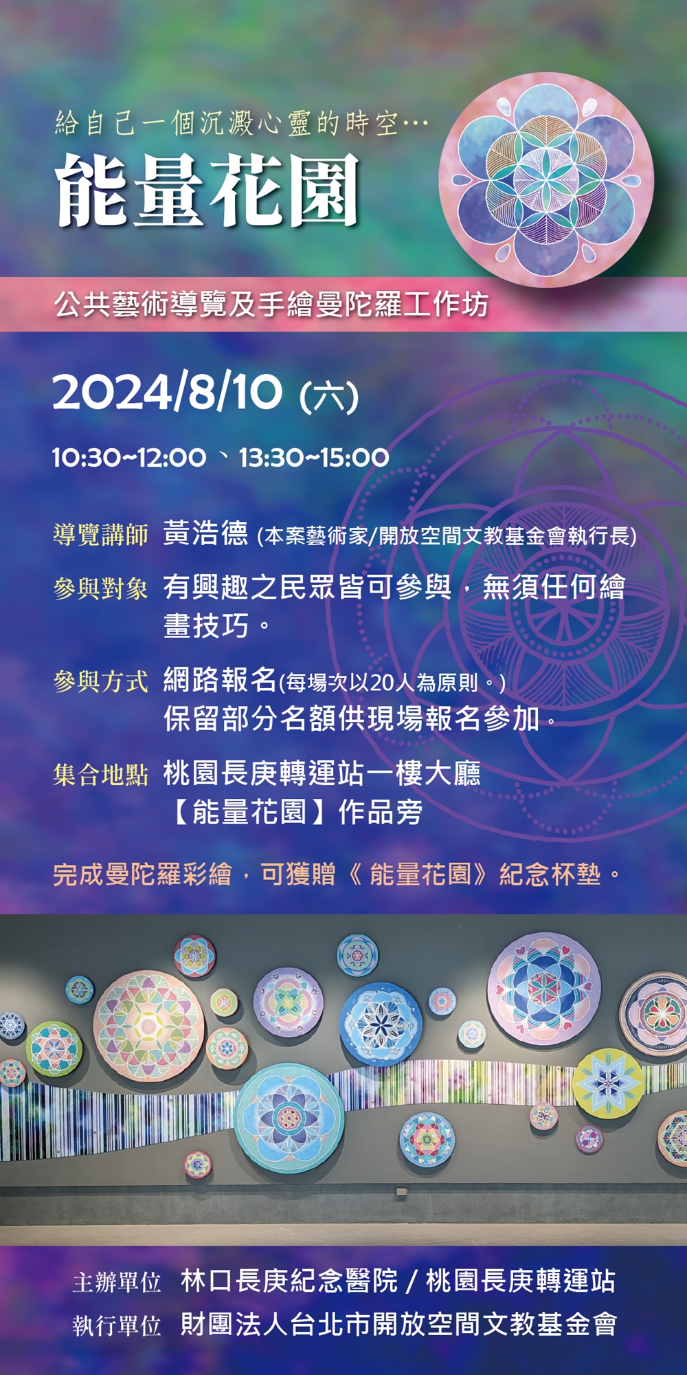 本活動將由本案藝術家黃浩德透過作品導覽及曼陀羅創作,一方面認識公共藝術作品,另方面帶大家一起靜心、專注、摒除雜念,讓日常繁亂的心靈沉澱下來,重歸平靜,找回初心,進而凝聚正 面能量,達到紓壓及療癒的效果。