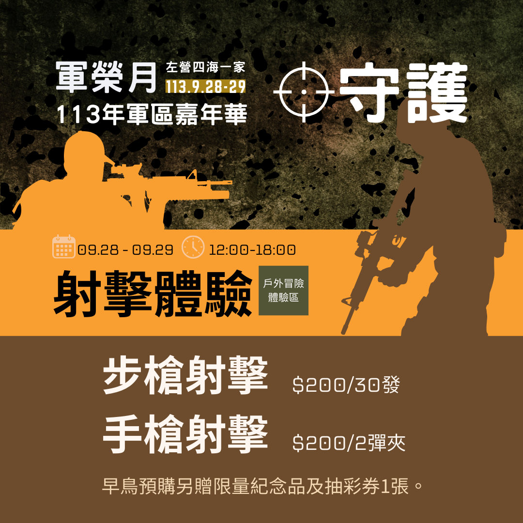 🪖 體驗項目 射擊體驗:步槍、手槍(早鳥預購,報到時付費)(使用過程需有教官人員在旁指導,12歲以下建議父母全程陪同)