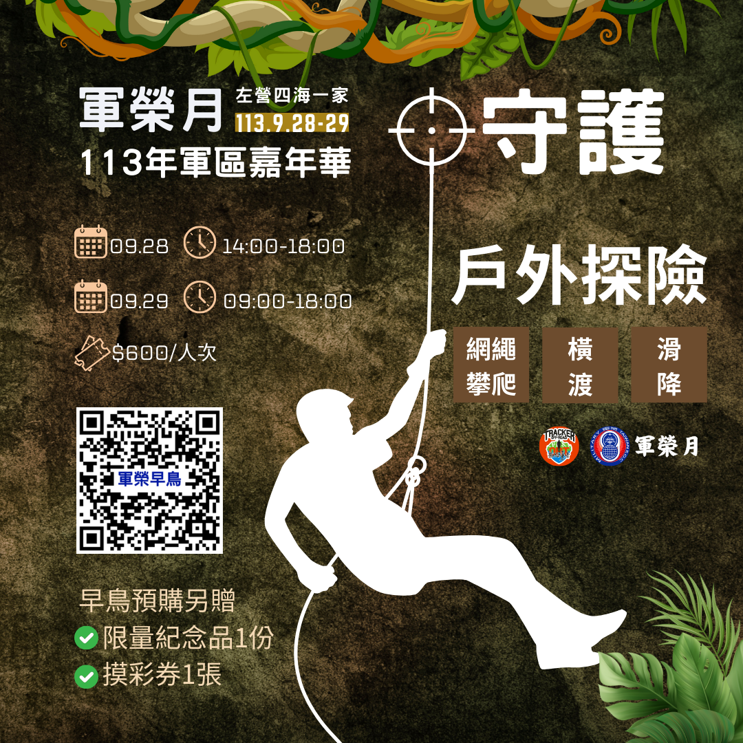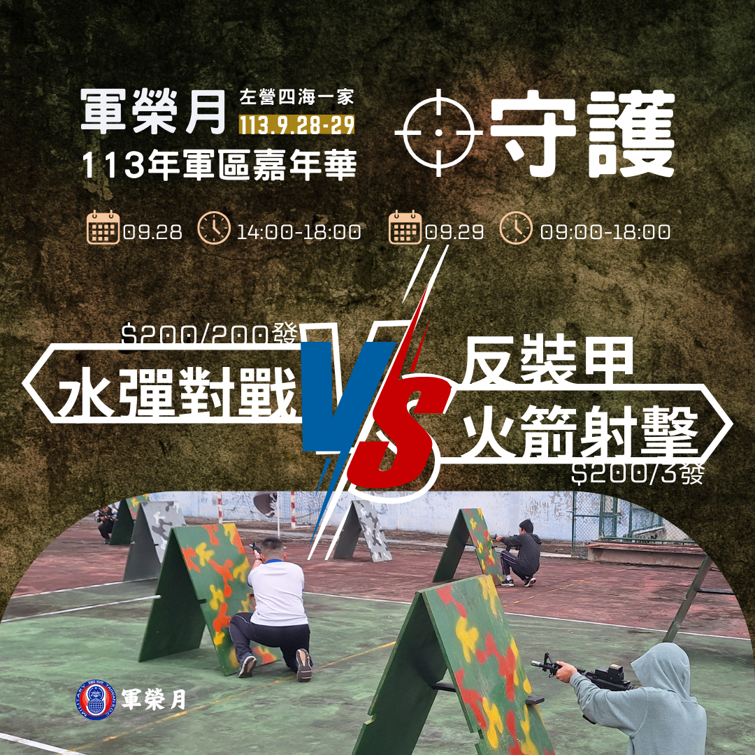 📝 活動內容 113年軍榮月 - 軍區嘉年華「守護」系列活動,包含:軍事文化嘉年華盛典、軍武裝備展示、軍樂儀隊展演及軍風文創美食市集等四大區塊,透過豐富多元的軍事風格結合獨特體驗活動,多樣精采內容邀請大家前來參與。