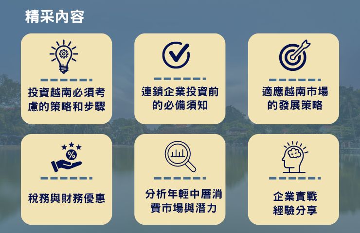 參加講座將讓您一窺越南市場的獨特性和業務機會,幫助您順利進入越南市場並快速適應當地商業環境,全面揭示如何在越南市場中成功立足和獲利。