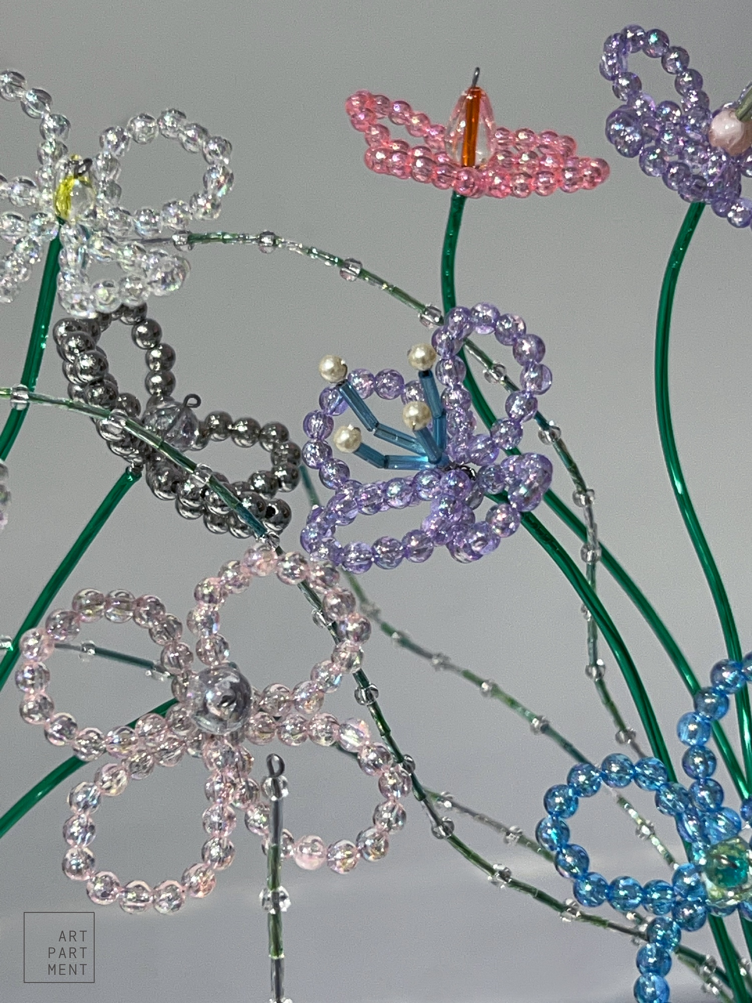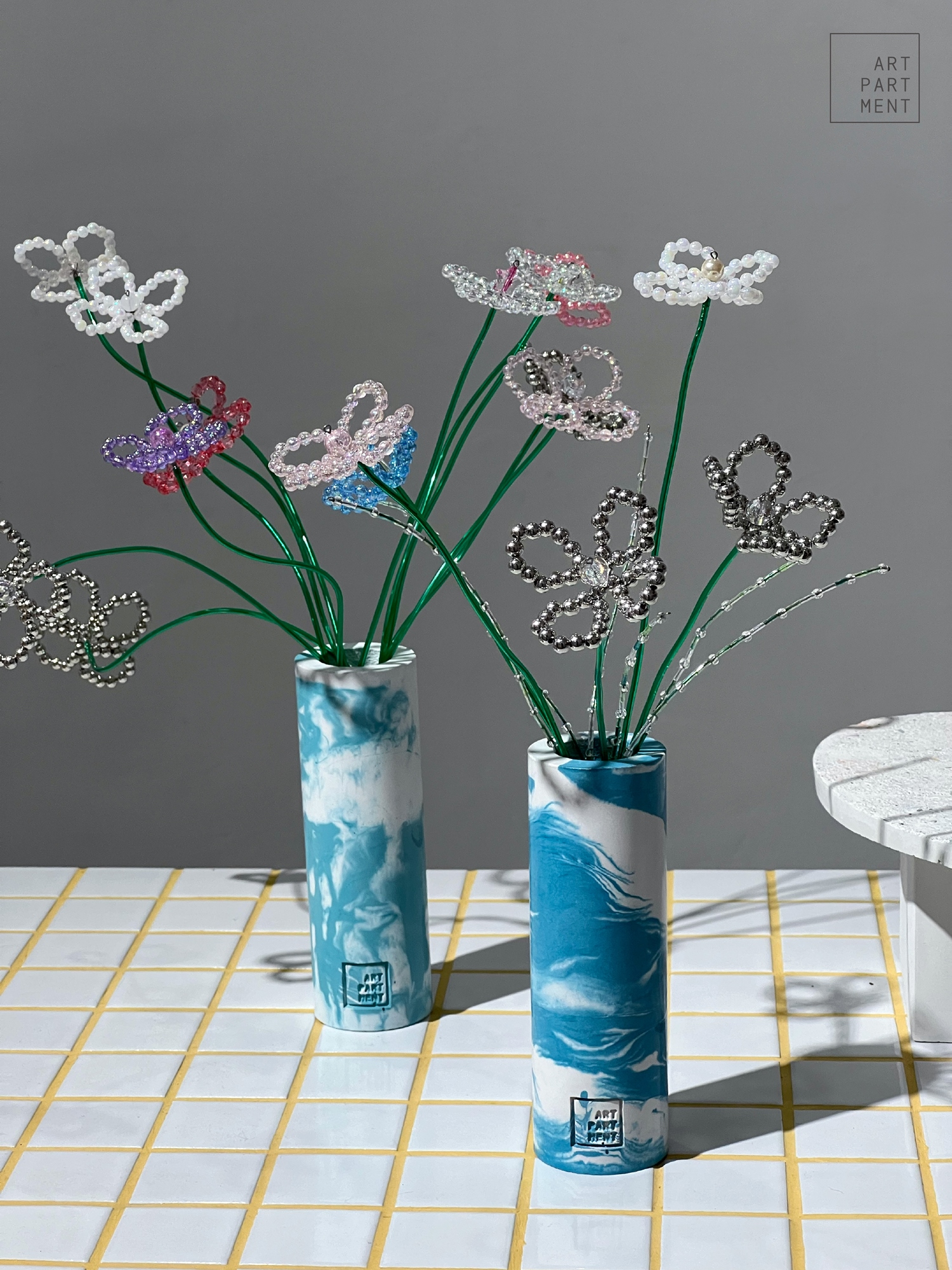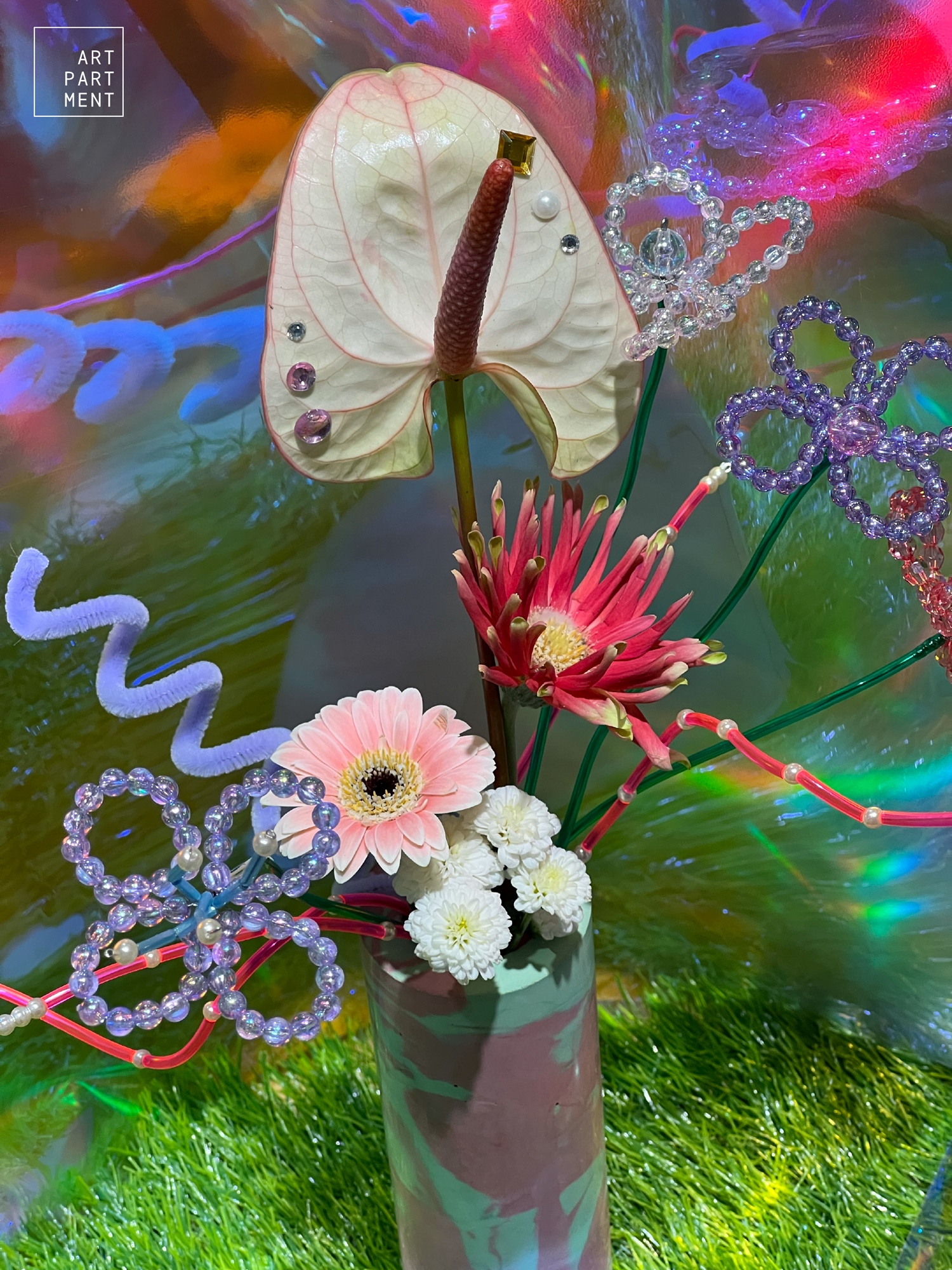 藝術公寓的珠珠花藝課,可以自由的搭配、選色和盡情的彎曲,以複合媒材的串珠所組成的花卉植物,佐藝術公寓所製作的「小瓶」瓶器,完成一堂永不凋謝的手作花藝課。現在報名「珠珠花藝課」可獲得「藝術公寓限量設計貼紙」乙張!