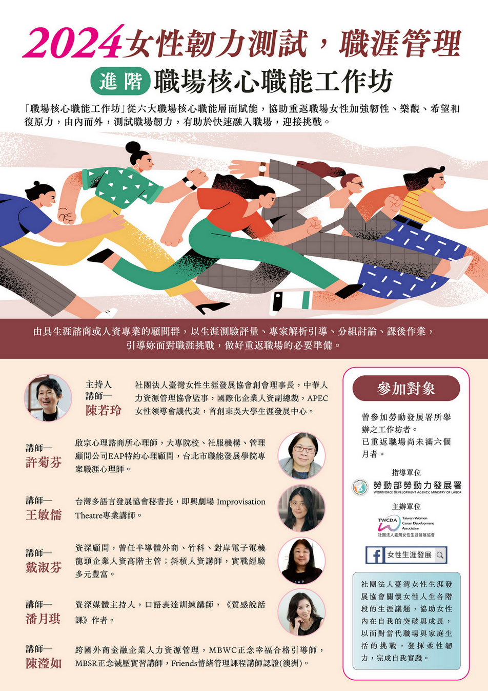 重返職場,重新發光發熱!我們誠摯邀請二度就業與中高齡就業女性參加韌力測試,職涯管理[ 2024女性職場核心職能工作坊(進階) ],協助您在返職前後進行韌力測試,強化六大職場核心職能,為職涯永續奠定堅實基礎。