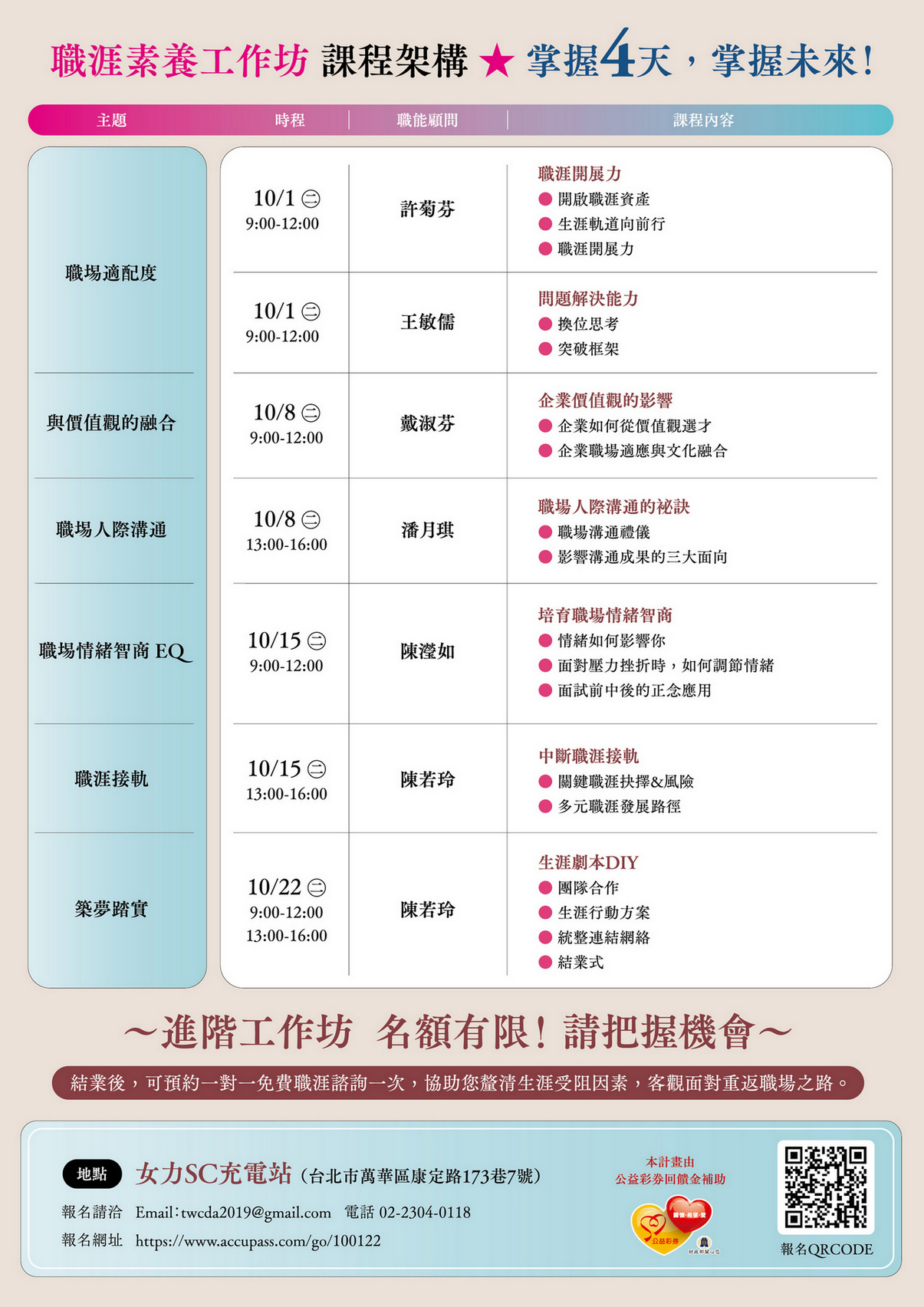 - 專業講師陪您同行:工作坊專業講師都是具備生涯諮商或人力資源專業背景的職人。她們深知職場挑戰,能夠為您提供個性化引導,讓您做好重返職場的充分準備。
