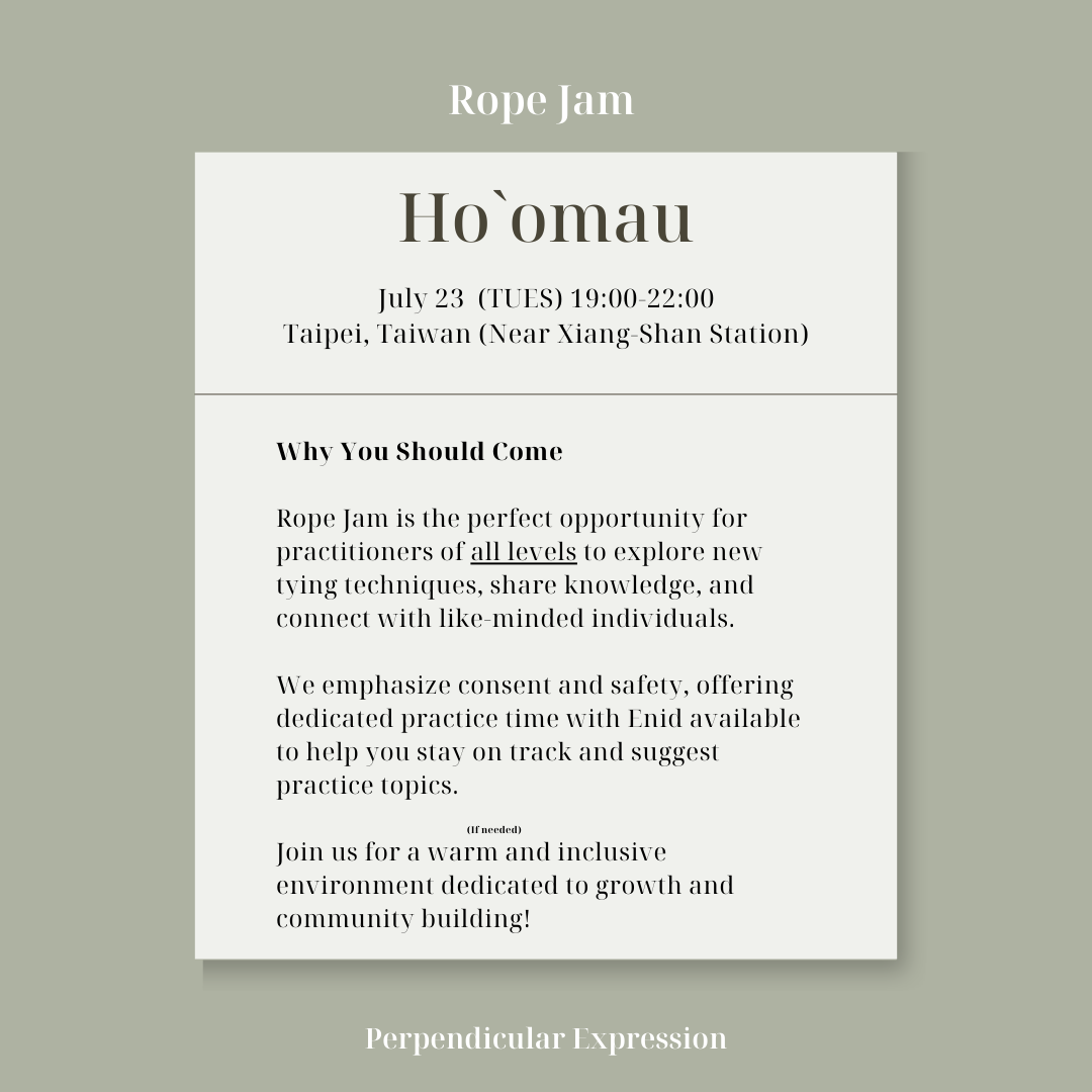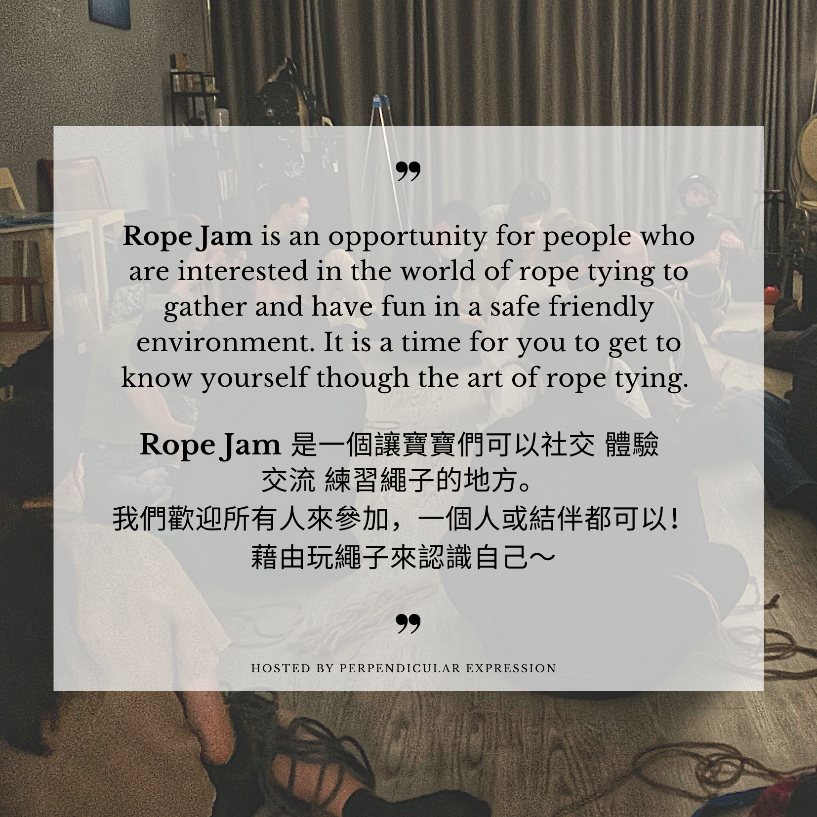 此次Rope Jam 是一個以地面繩縛為主的聚會!您可以在這裡體驗/學習/練習利用繩子探索自我、認識他人!現場將提供各種迷你工作坊和示範,無論您是初學者還是有經驗的愛好者,都能在這裡實踐、學習與分享。