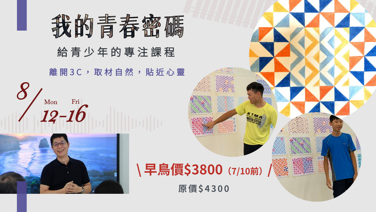 手繪幾何,視覺化的創作過程中,創意很輕巧,但需要消耗大量的耐心與專注,於是青少年的浮躁與叛逆得到紓解與安定。他們用色彩在規律交織出變化的韻律裡尋求堅定的信念,那是由他們的雙手與心智專注投入創作的結果。