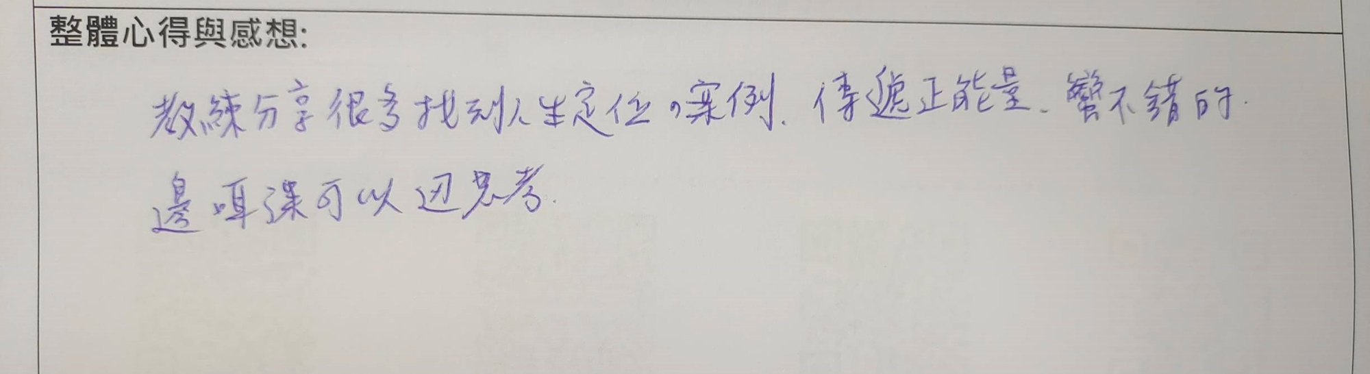• 教練的人生定位課程很扎實,一切都很滿意,能量滿載而歸!