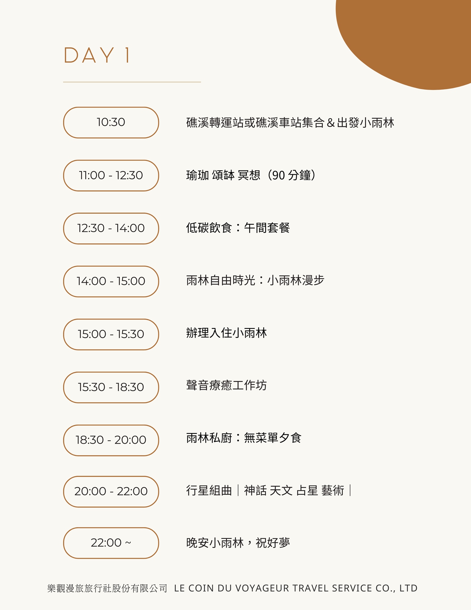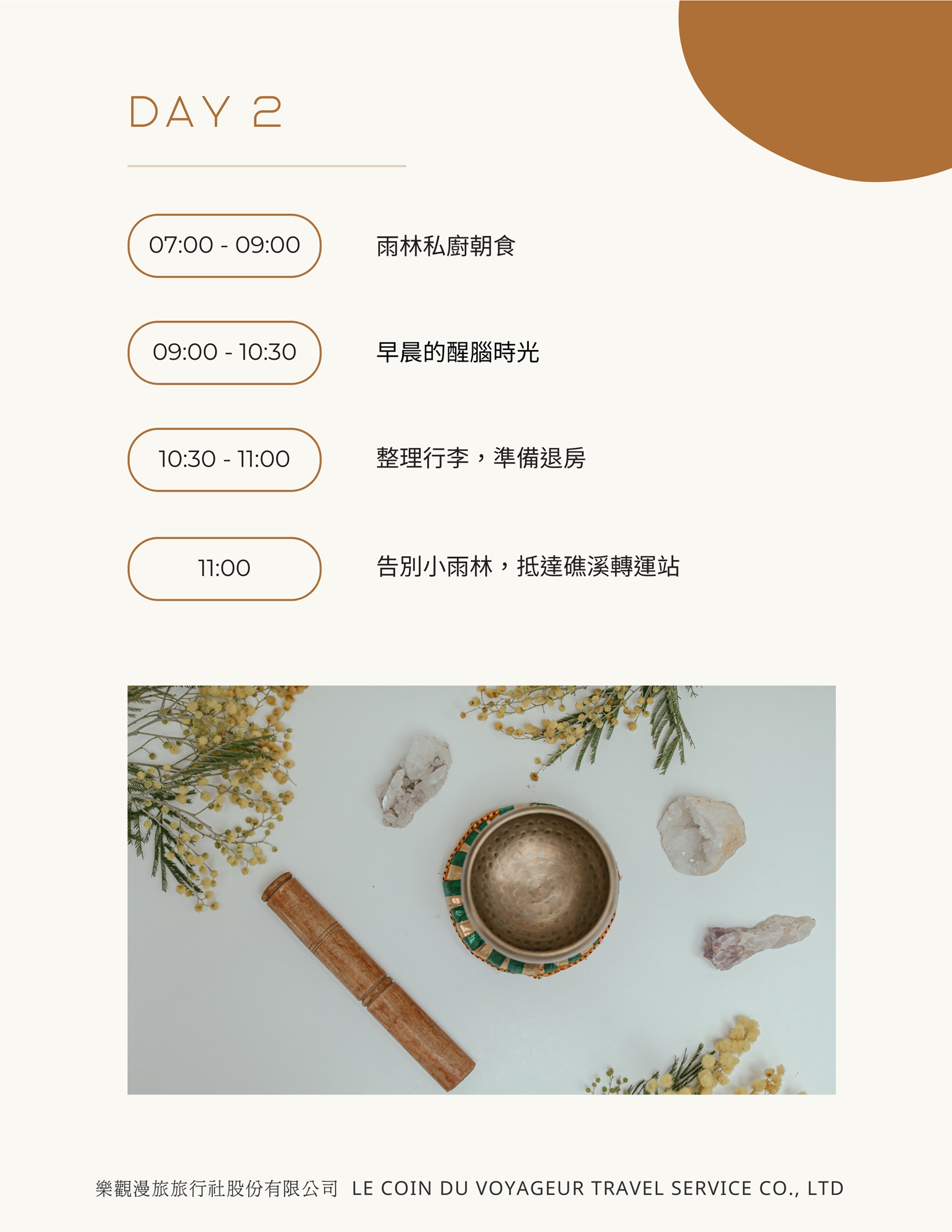 - 頌缽體驗:在老師的引導下體驗頌缽,身體療癒是自我療癒的第一道光,每個人都可以選擇一顆缽在此次旅途中隨時相伴,享受療癒時光。