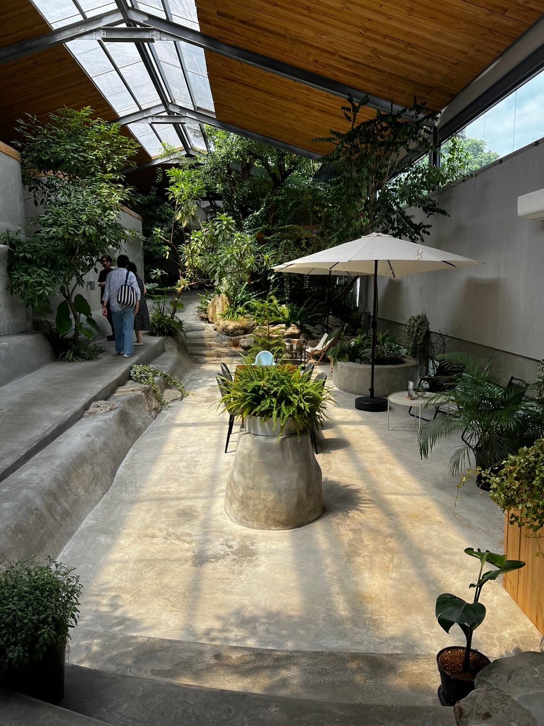 場域中心,一棵古老的樟樹傲然矗立,穿越天窗,無論晴雨,陽光與雨水自然地灑入,滋養這片神聖的空間。
