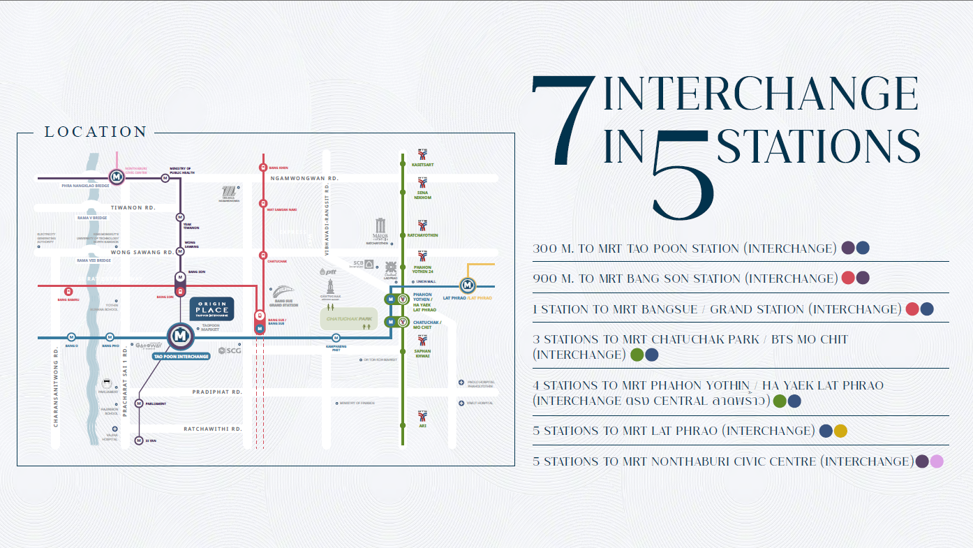 距離ORIGIN PLACE TAOPOON INTERCHANGE搭乘MRT一站,是泰國新的鐵路樞紐 Bang Sue 大車站。BangSue大車站取代位於華南蓬的曼谷火車站,作為曼谷所有長途鐵路服務的終點站。為東南亞最大的火車站,擁有26個月台,建築面積達264,862 ㎡²,車站周圍218Rai(約35公頃)的區域將開發為巨型商業中心