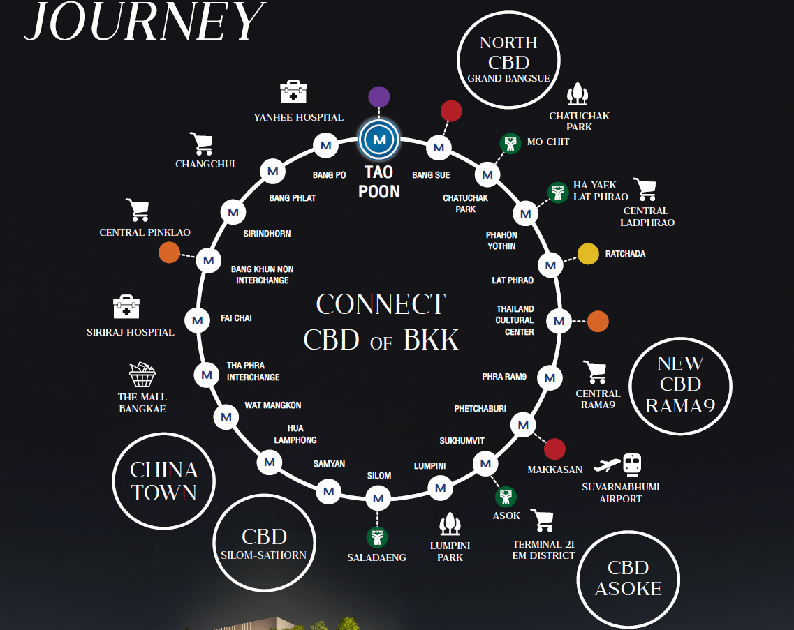 MRT環狀線生活圈-邦蘇車站(中泰高鐵)、Rama9(拉瑪九新商業區)、Asoke阿索克-素坤逸商業區(Terminal21 航站樓百貨)、Silom-Sathorn是隆-沙吞金融中心(王權大樓 曼谷最高樓)、China Town中國城