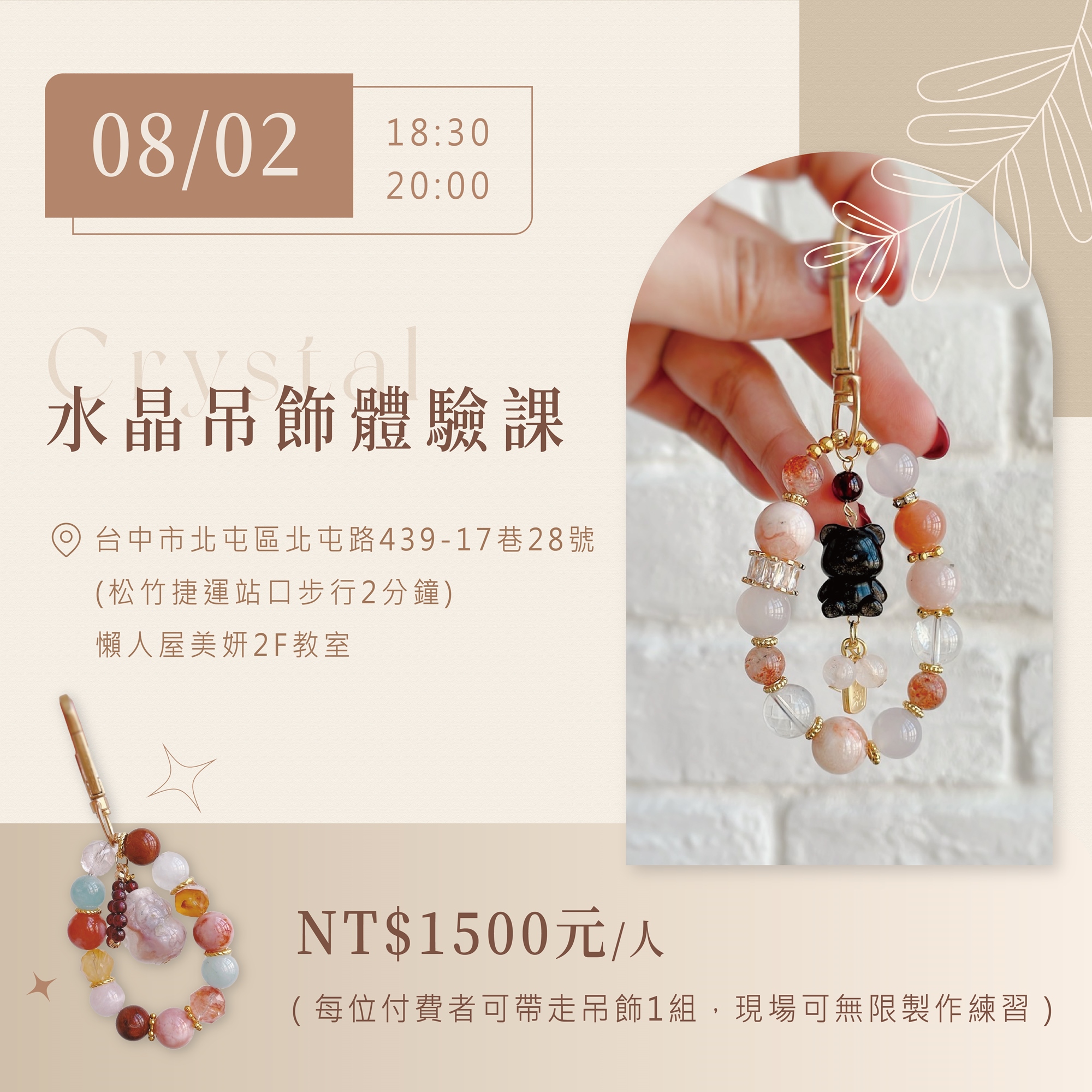 ⚠️ 吊掛配件以金銀曜石、螢石配件為主,可加價換購其他水晶配件。課程為自由創作課程,可以自行搭配喜歡的水晶,並非教學指定款式。