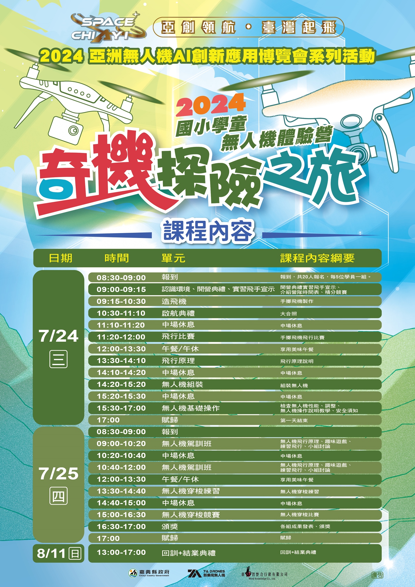 無人機產業除了國防軍事應用外,更能廣泛的應用於農業、災害救助中,嘉義縣具平原、農田、村落、海岸、養殖、丘陵、高山等多元環境,做為未來無人機產業的發展及研究場域極具優勢。產業的永續發展,需要從教育開始,為了讓無人機等未來產業向下紮根,針對國小和國高中學生設計不同的「無人機飛行體驗營」活動,從體驗培養興趣,興趣養成專業,希望這些種子學員能成為產業永續發展的重要推手。