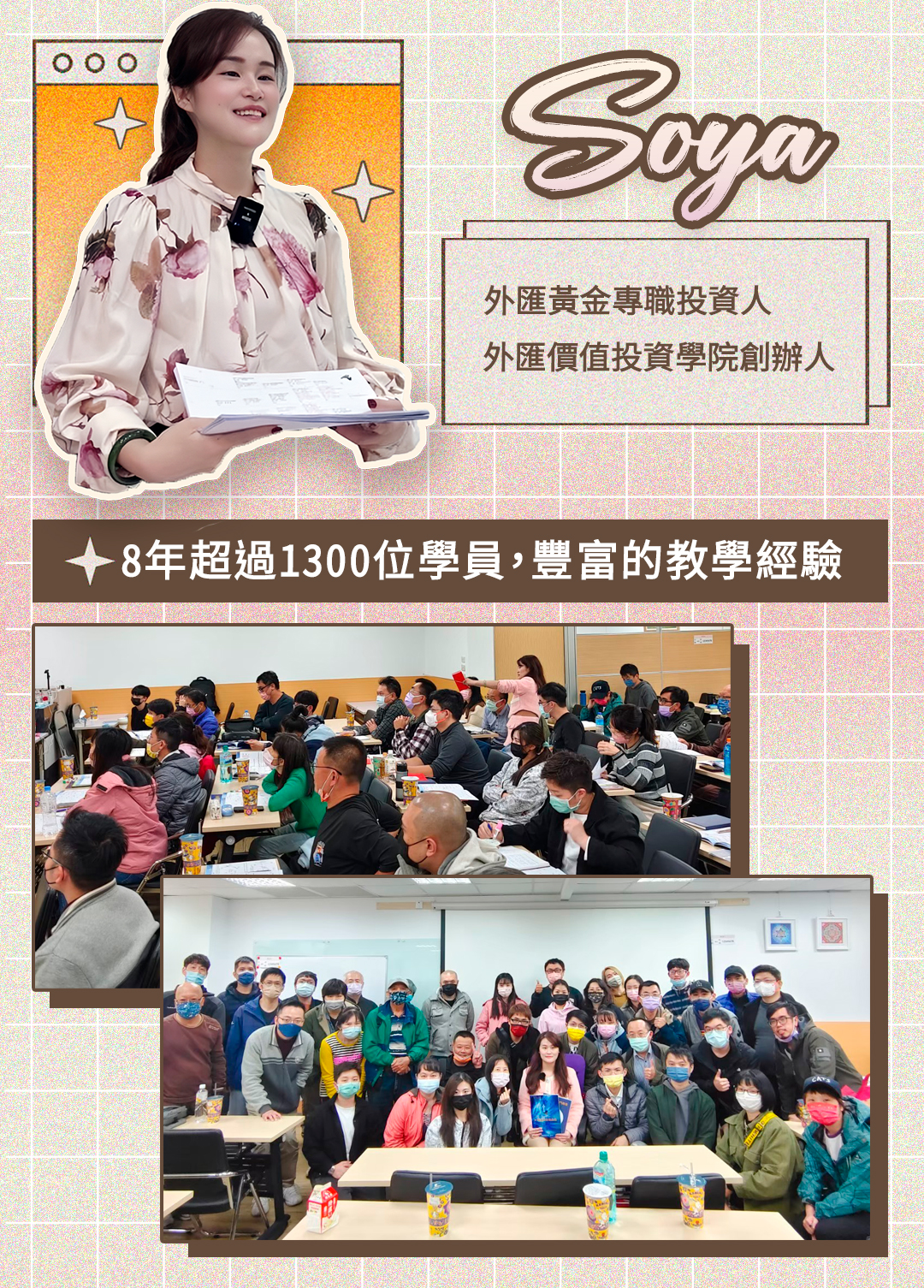 本次合作講師Soya,外匯價值投資學院創辦人,2016開始教學至今,全台數千名同學、8年外匯黃金實戰經歷,至今已舉辦數百場實體講座與課程。