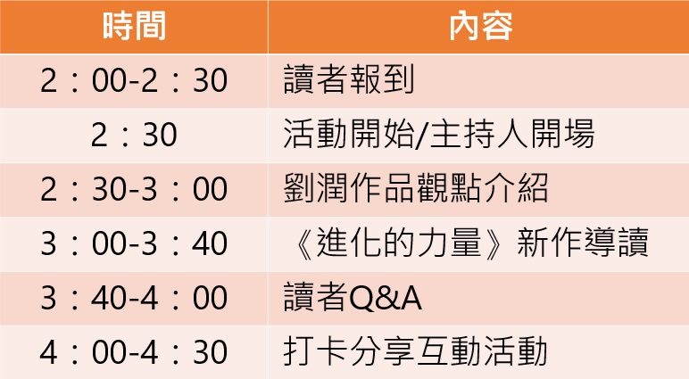 趁著新作品《進化的力量》出版,邀集喜好《底層邏輯》的讀者朋友們藉此機會共聚,並邀請專業講師暨推薦人導讀新書,預見台灣最新社會趨勢,分享過去著作的心得,共同互動交流討論。