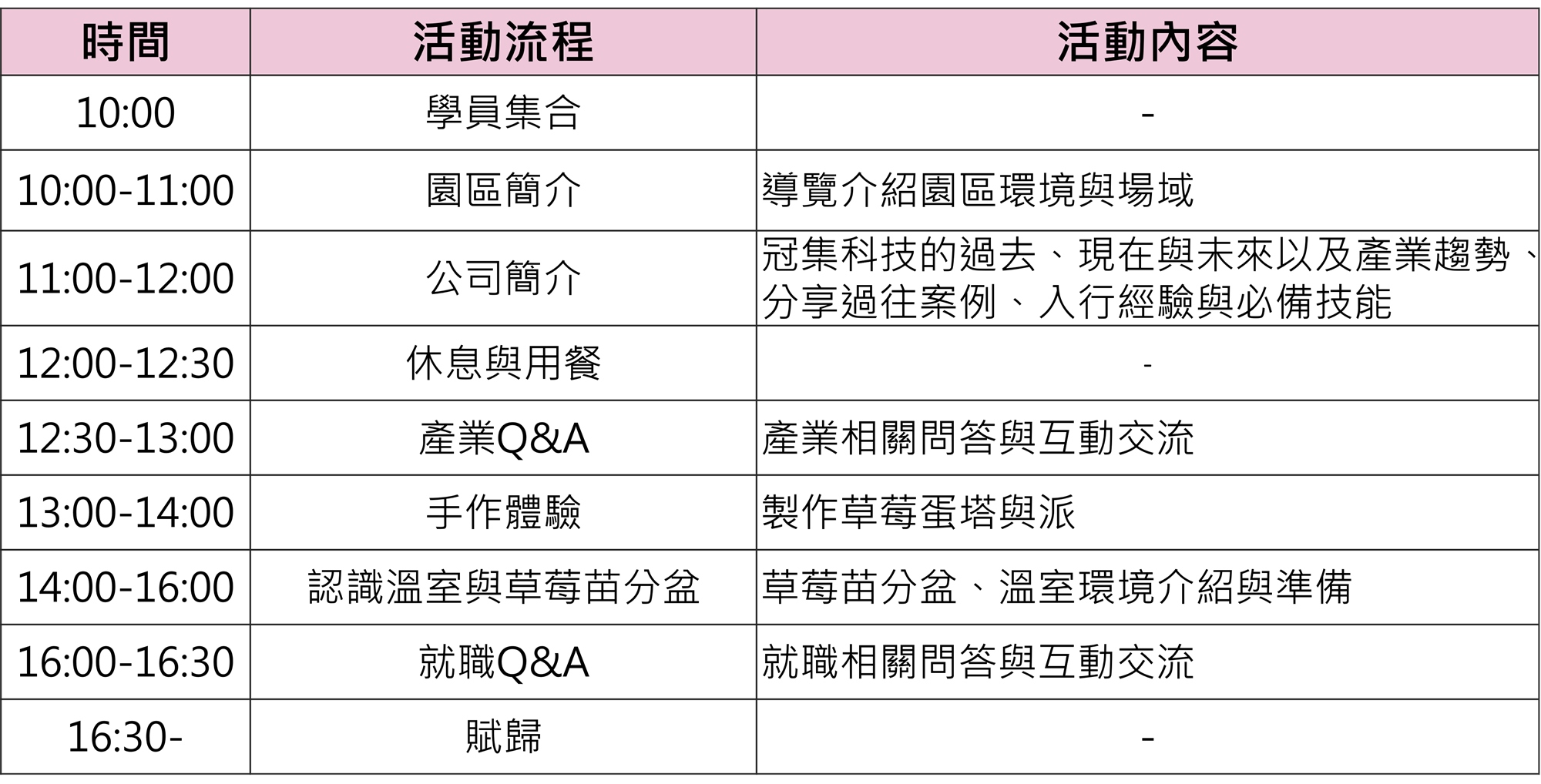 本場邀請到冠集科技有限公司草莓學校負責人-程浩軒,帶領大家參加草莓學校歡樂體驗日,一場結合知識、互動與美食的精華體驗。學員將動手製作美味的草莓蛋塔與派,享受親手烘焙的成就感,並學習草莓苗的分盆技術,了解溫室環境的準備和管理。此外,負責人還會解答就職相關問題,提供入行經驗與必備技能。
