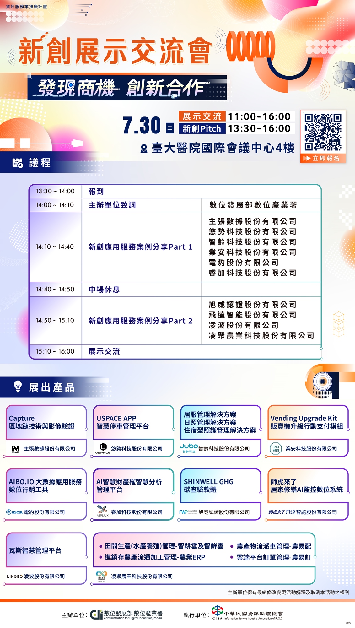 【新創展示交流會】 發現商機 創新合作📅 活動時間:113年7月30日(二) 13:30~16:00 (13:30-14:00報到) 🏠 活動地點:臺大醫院國際會議中心4樓 402會議室 (台北市中正區徐州路2號)