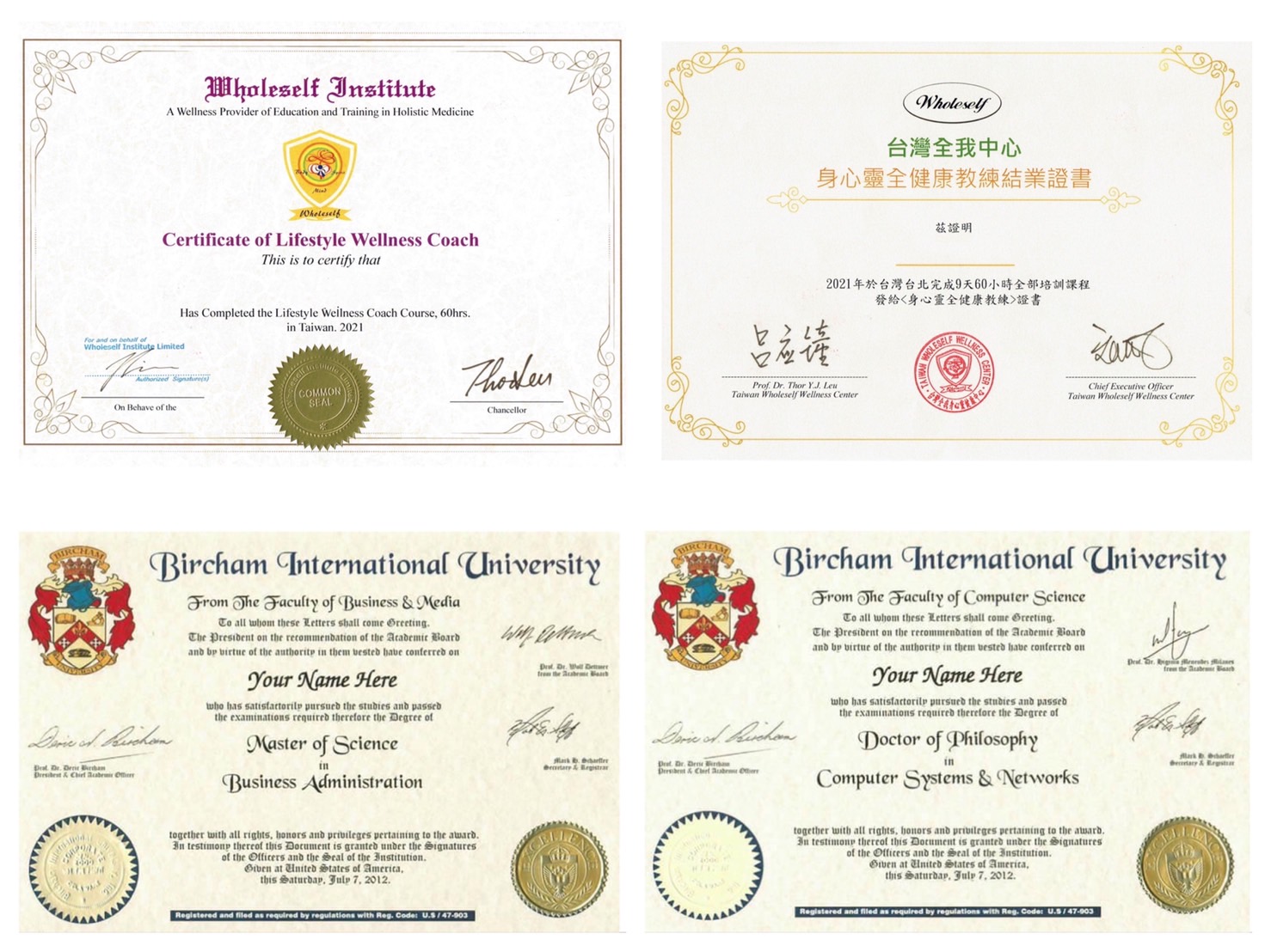 及美國Wholeself Institute《Wellness Coach》英文證書