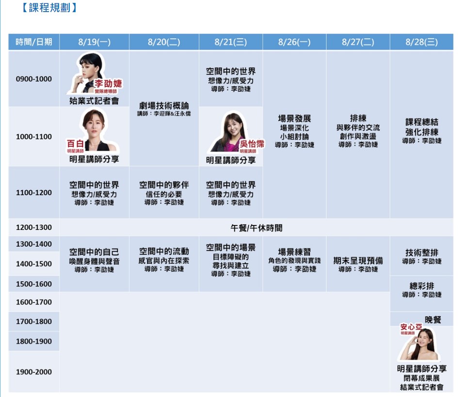 這次的講師陣容也是相當強大,有超有名的金鐘獎得主李劭婕老師、人氣女演員兼基隆城市代言安心亞老師、主持和演員兩棲吳怡霈老師、第23屆台北電影節最佳女配角百白老師,臺北藝術大學劇場藝術研究所表演組助教林俐瑜老師、故事工廠的技術總監李迎輝老師、資深的劇場工作者汪永儒老師,眾多頂尖師資集結,保證讓你眼界大開!
