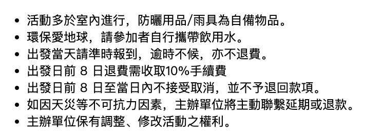*每條遊程皆為兩個體驗內容,體驗的選擇於後續流程報名表中填寫
