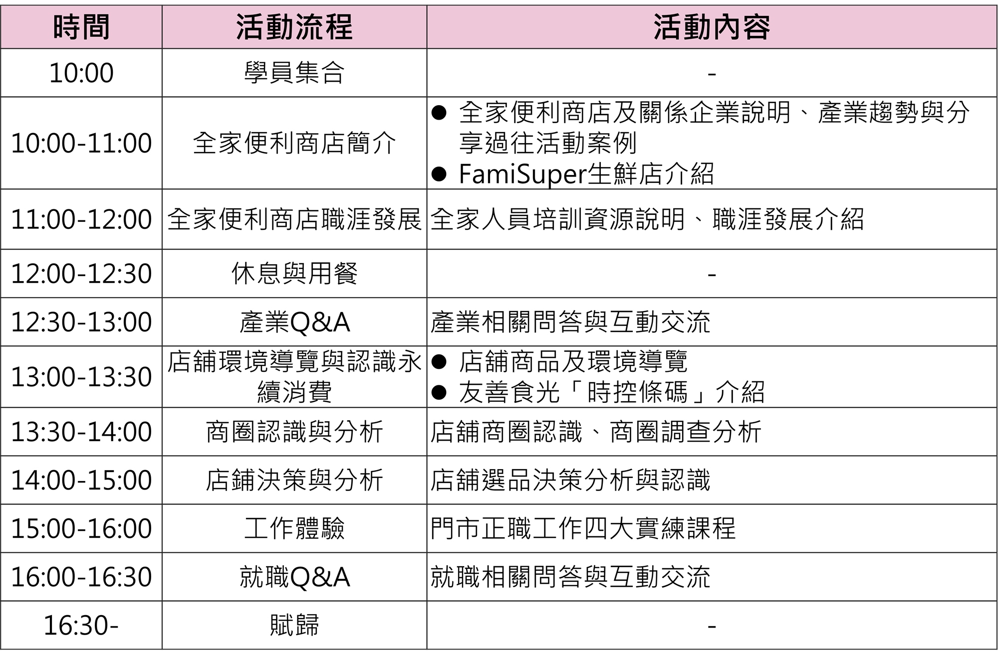 本場邀請到全家便利商店人資經理-劉羿佑,揭密全家便利商店及關係企業、分享過往案例與經驗,並介紹 FamiSuper 店的營運規劃,為學員們解惑便利商店產業未來趨勢的疑問。下午透過商圈認識與分析,瞭解與學習店鋪選品秘辛,並體驗門市背後正職的工作內容,讓學員不再只是認識超商的兼職工作,讓我們一起突破想像:未來,時時刻刻都在「全家」!