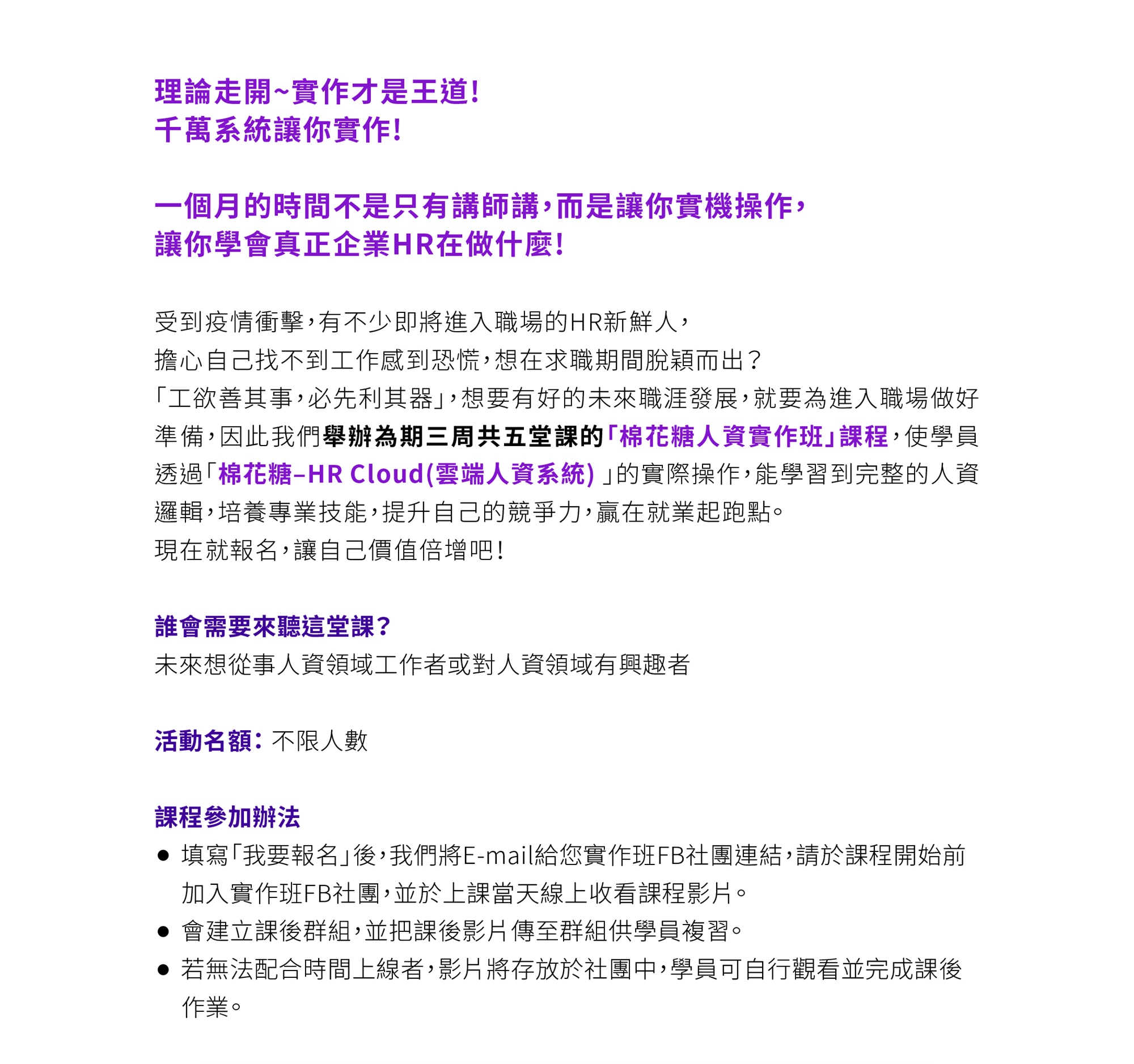 - 填寫「我要報名」後,我們將E-mail給您實作班FB社團連結,請於課程開始前加入實作班FB社團,並於上課當天線上收看課程影片。