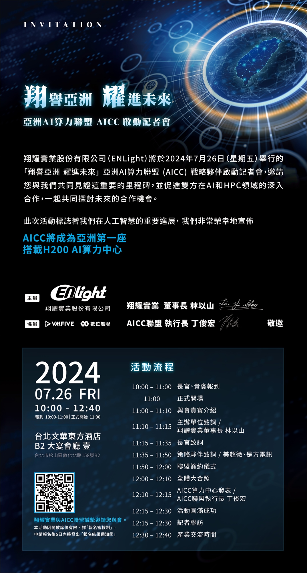 在AI算力即國力的時代,由翔耀實業(ENLight)與是方電訊(Chief Telecom)、第五代虛擬科技(VMFIVE)、數位無限(Infinitix) 推動成立台灣最先進的AI算力聯盟 AICC,宣布正式啟動。
