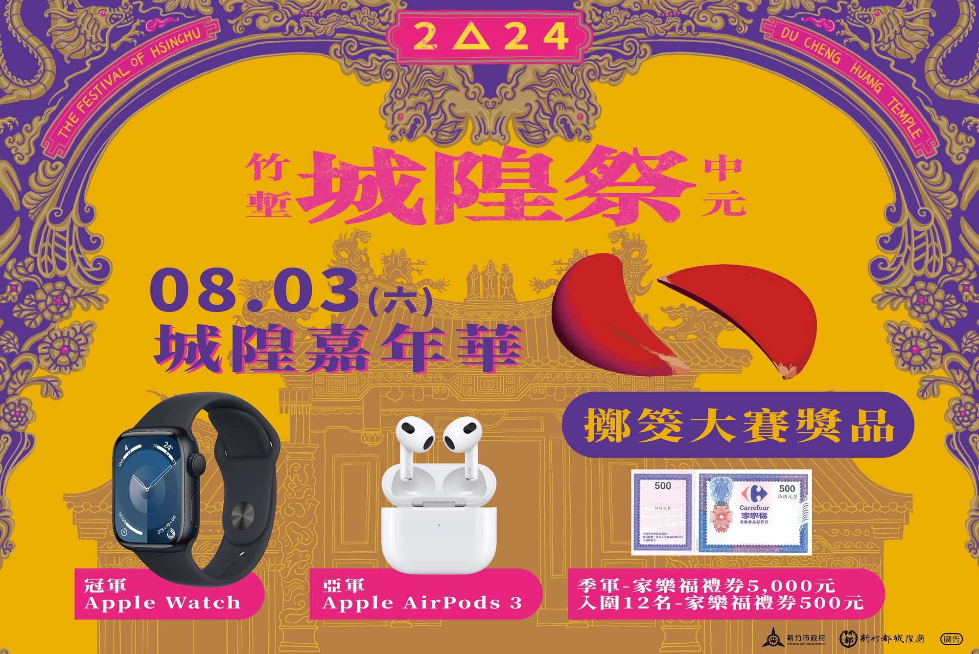 【2024竹塹中元城隍祭】是新竹市一年一度最重要的盛事,今年特別舉辦8/3「城隍嘉年華活動 」,重頭戲為「擲筊大賽」活動,邀請大家一起來「搏」聖筊、拿大獎,免費報名體驗,快將大獎Apple Watch、Apple AirPods 3、家樂福禮券抱回家!通通有獎,來參加活動就有機會獲得城隍聯名小禮物喔~🎁