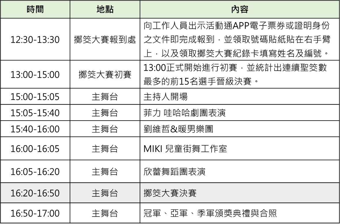 二、活動報到:請於8/3(六)12:30至13:30之間於「擲筊大賽網路報到處」向工作人員出示活動通APP電子票券或證明身份之文件即完成報到,並領取號碼貼紙貼在右手臂上,以及領取擲筊大賽紀錄卡填寫姓名及編號,如超過13:45尚未報到將視同放棄參加資格,並將此名額開放現場民眾。