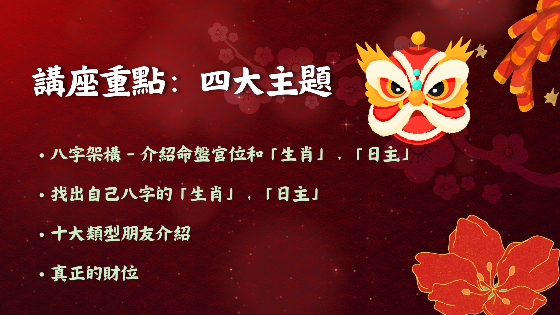 不要錯過這個難得的機會,參加我們的八字講座,一窺八字命理學的神秘之謎,並探索命運的奧秘。我們期待與您一起分享這個精彩的旅程!