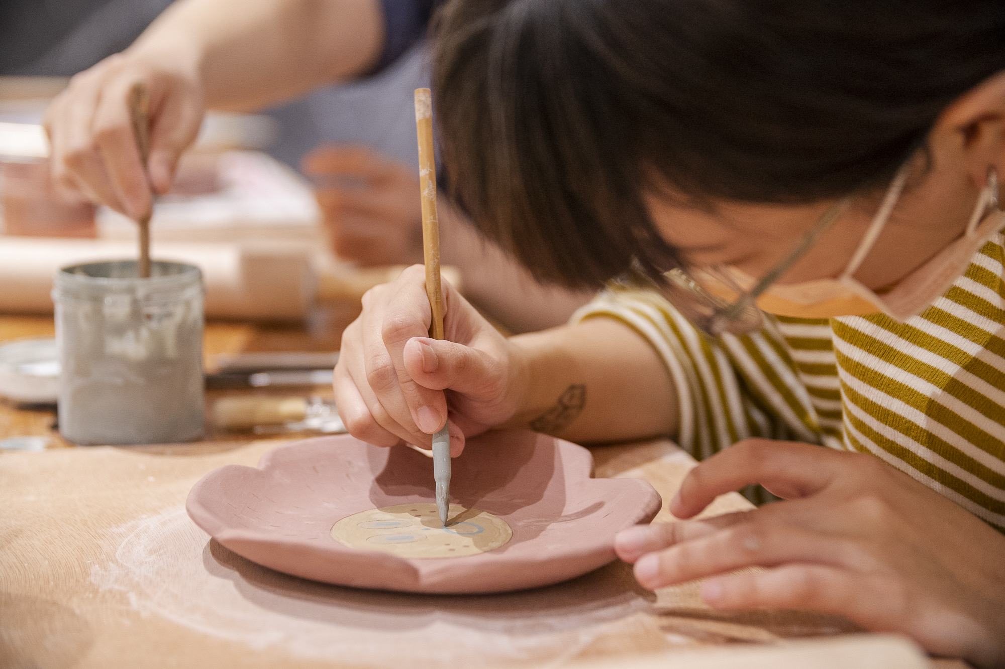 陶瓷燒製流程介紹、陶板成型、 裝飾技法應用、利用化妝土,上色在土胚上。