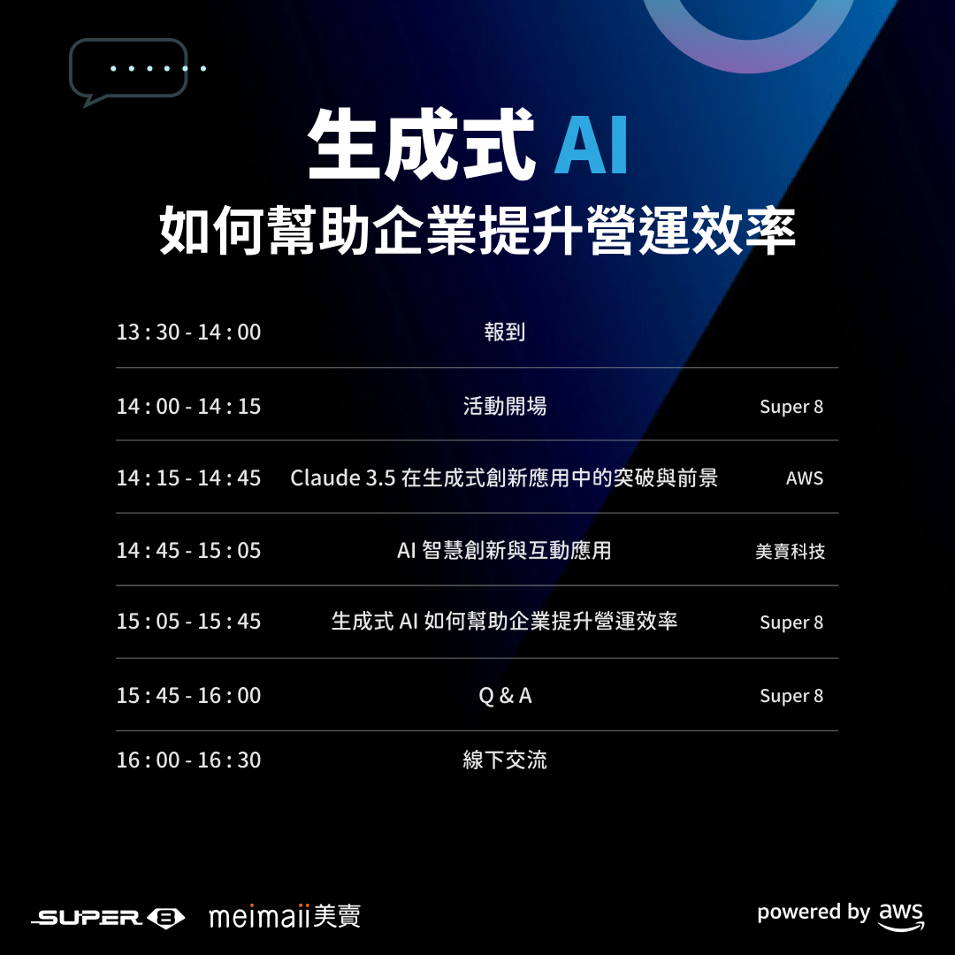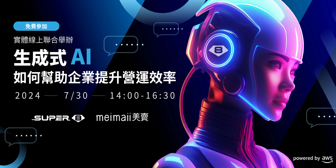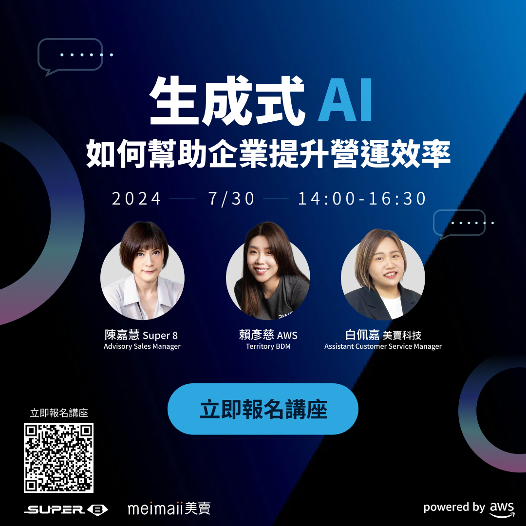 為此,Super 8 將於 2024 年 7 月 30 日舉辦「生成式 AI 如何幫助企業提升營運效率」講座,為您帶來最新的行銷科技應用洞見。本次講座邀請了 AWS 分享 Claude 3.5 在生成式創新應用中的突破與前景,以及 美賣科技介紹電商如何成功導入 AI 技術,提升互動和銷售轉換率,並展示具體的應用成效。