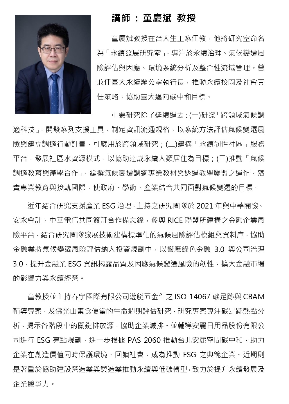 本次講座將深入探討ESG的核心理念及其在企業永續發展中的重要性,同時分析當前永續發展的情勢與熱門議題,提供實用的策略與方法,幫助企業在轉型過程中實現永續發展。特別邀請台灣永續治理先驅童慶斌教授,分享如何利用永續治理的思維,利用有系統,有方法,有效率的逐步完善永續轉型計畫,讓企業在執行ESG又能兼顧本業,在激烈的市場競爭中保持優勢。