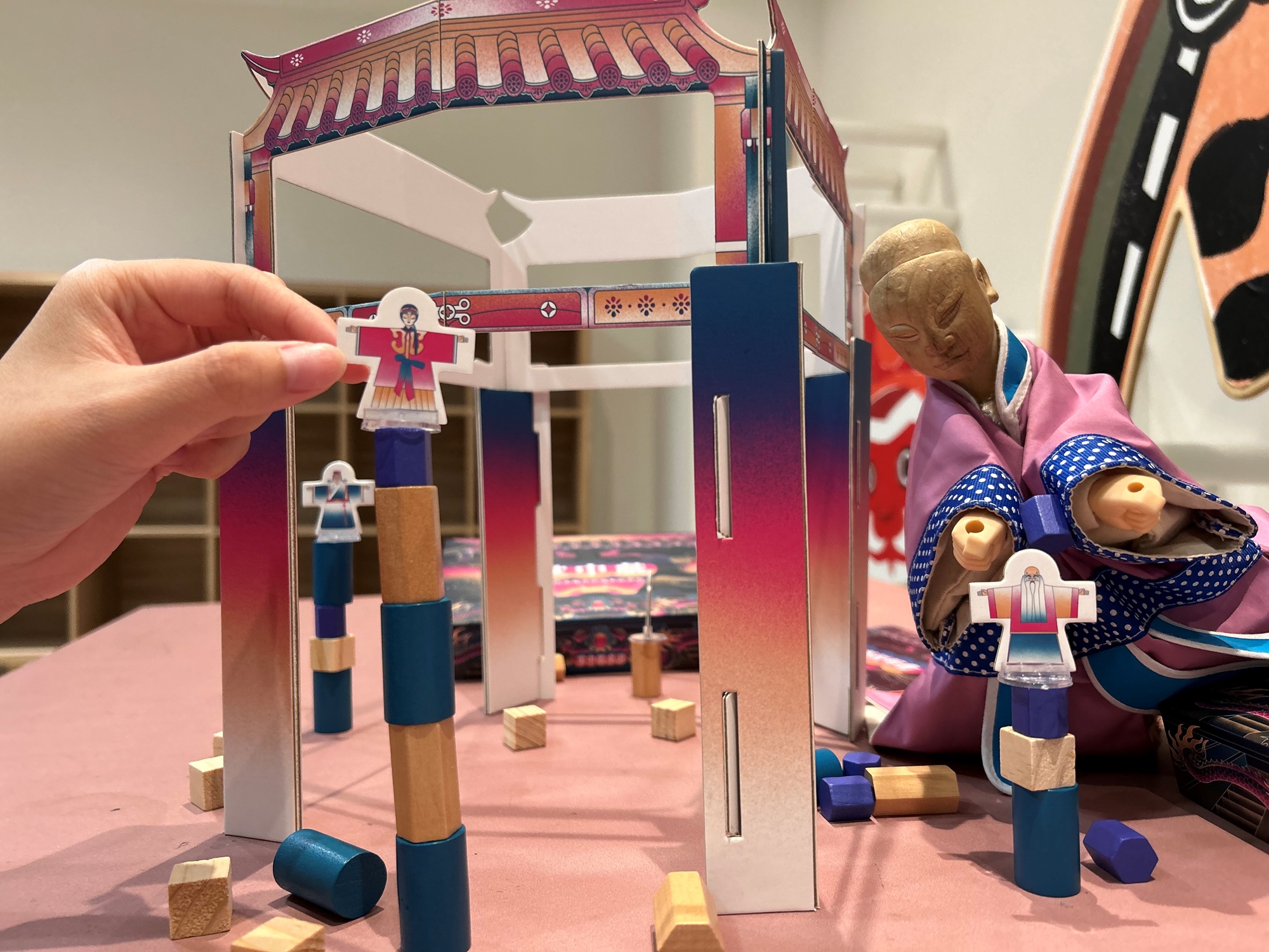 延續之前舞蹈⼩品的發展,不只讓身體變成紙紮⼈偶之⼀,同時嘗試將組裝紙紮⼈時所需要的材料(紙、⽵藤等)於組裝中⼀同作為玩耍的路徑;製作紙紮⼈過程中,需要「紮」、「剪」、「堆」、「糊」、「裝」等程序,如果於這些紮作程序裡,也把「紙」化作不同的樣⼦呢︖把「紙」做成不同的物件,⽤組裝、拼貼的⽅式,像積⽊、建築、⼈偶等,堆疊跟建造⼀個個不同的型態,形成各種樣態的「偶」。