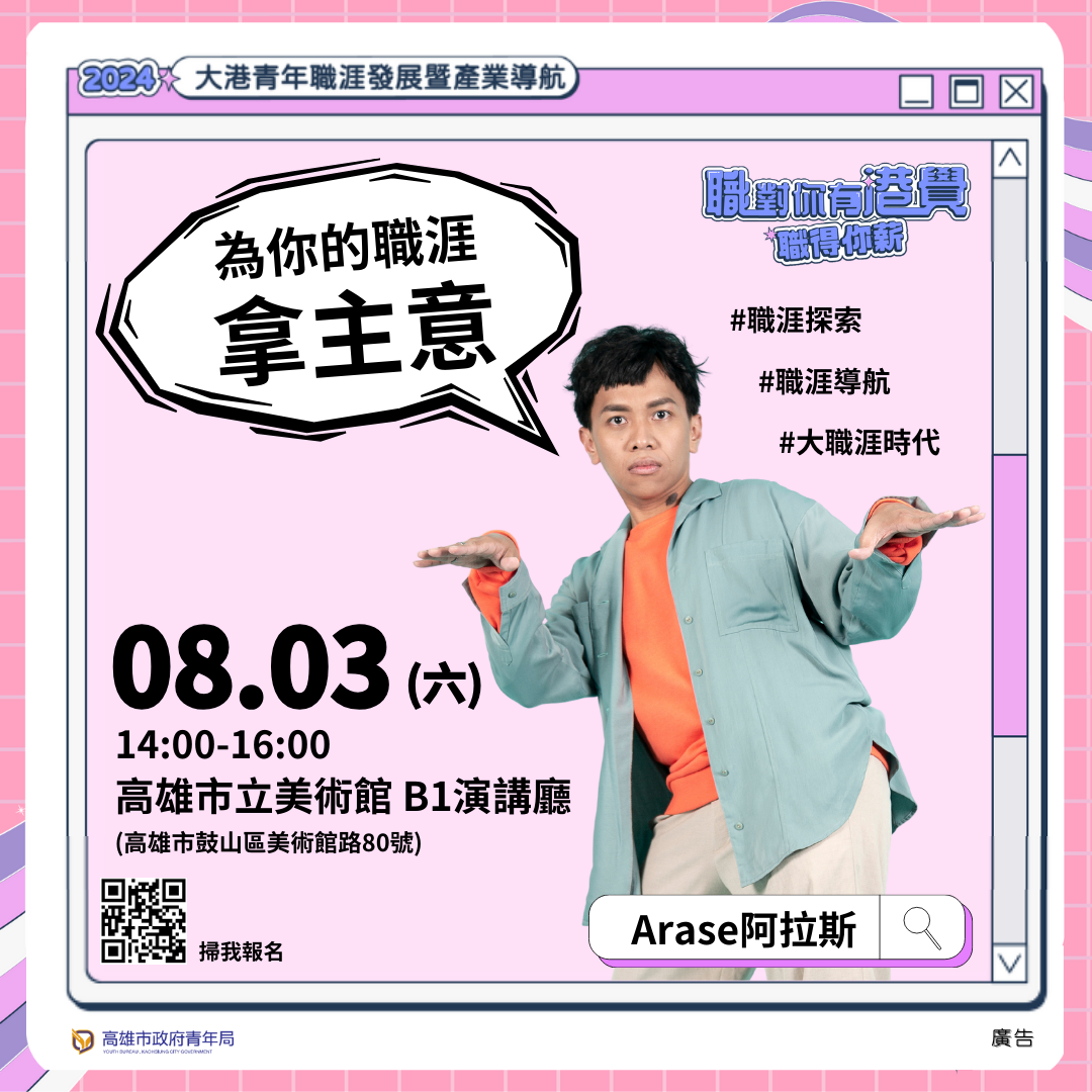 阿拉斯憑藉其多樣的職業經歷和豐富的生活閱歷,將在本次演講中分享他的斜槓人生與成長經歷,並探討如何在成長過程中做出每一個選擇,以及如何以幽默風趣和樂觀的態度面對挑戰。他的故事將激勵和鼓舞青年朋友,幫助他們在職涯發展中找到自己的方向,成為自己職涯的主人。