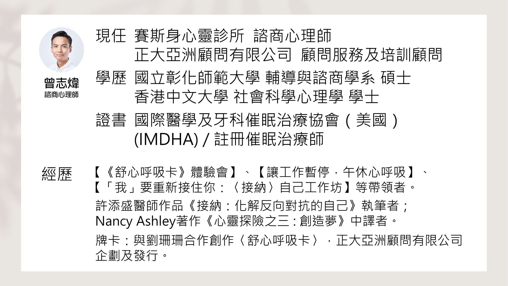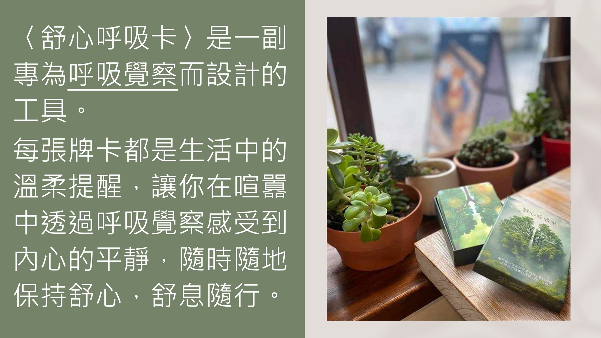 💡由曾志煒諮商心理師與您分享呼吸與身心的關係,與您一同體驗〈舒心呼吸卡〉的使用方法和效用。更有呼吸靜心練習引導,引領您發現內在的平靜、享受當下的美好。