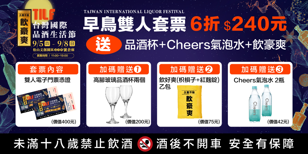 此展特搜全球各地好酒齊聚一堂,讓大家一票逛好喝好,即日起推出早鳥6折優惠雙人套票$240元(價值$400元),加碼再送「玻璃高腳品酒杯」兩個+「飲豪爽」乙包+Cheers氣泡水 兩瓶,如欲前往參觀請把握早鳥名額,其中最有看頭的地方還有全球限額的珍稀藏酒、傳承名酒、聯名酒款...等首展,邀您一同蒞臨品酩世界好酒!