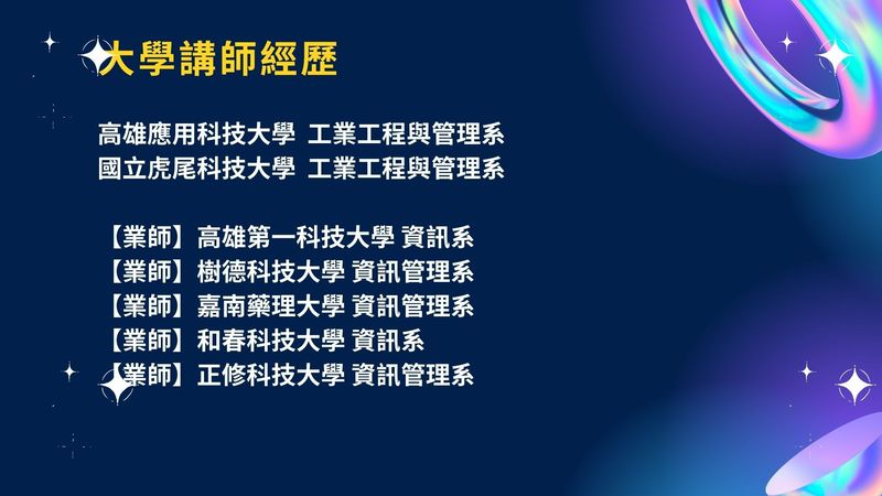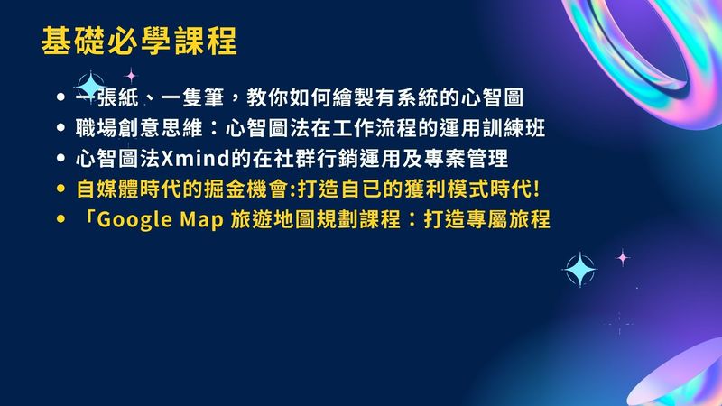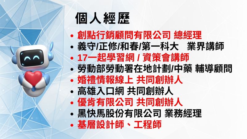 也介紹我們的翼帆老師,是創點行銷顧問有限公司的總經理、業界講師、輔導顧問,同時也是多家企業的共同創辦人。他擅長網頁設計、網站系統、分銷聯盟購物系統開發及網路行銷,並擁有輔導近600多客戶的豐富實務市場經驗。翼帆老師的專長課程涵蓋網路趨勢行銷、LINE/FB/Wechat社群經營、網站經營、SEO關鍵字優化、創業規劃、心智圖、人才培訓、業務領導及講師培訓等領域。