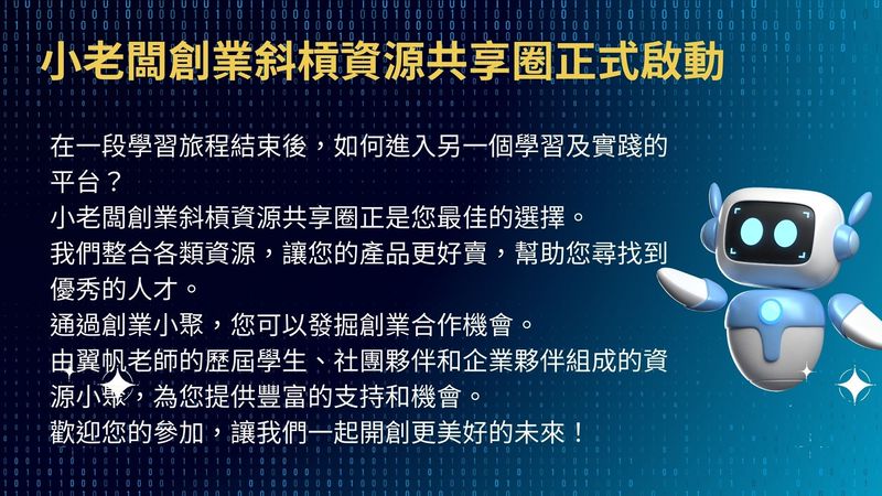 與你攜手翼帆老師,誠邀您加入「創業斜槓資源共享圈」,探索更多斜槓工作的可能性。課程結束後,我們將提供豐富的交流機會,幫助您找到適合自己的興趣小組,並發掘斜槓創業的無限潛力。
