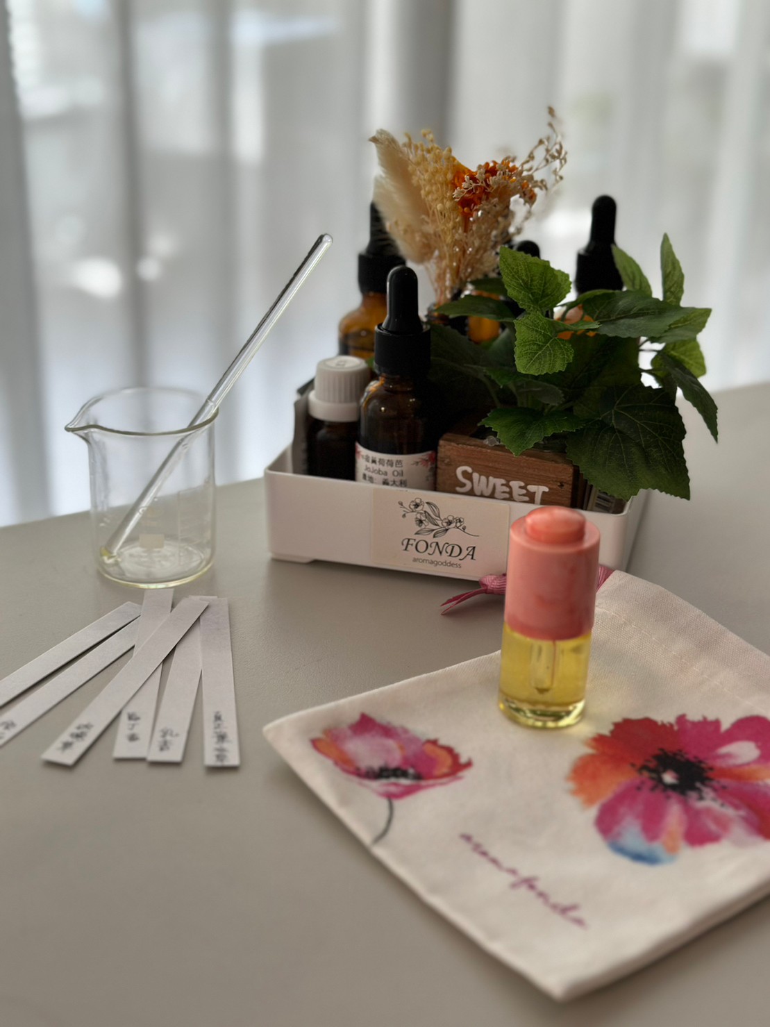 FONDA老師貼心的為大家嚴選平價好入手的精油,於課堂上分享使用方法,結束後還可以體驗調香,製作自己專屬,獨一無二的 香氛保養油30ML 帶回家喔!