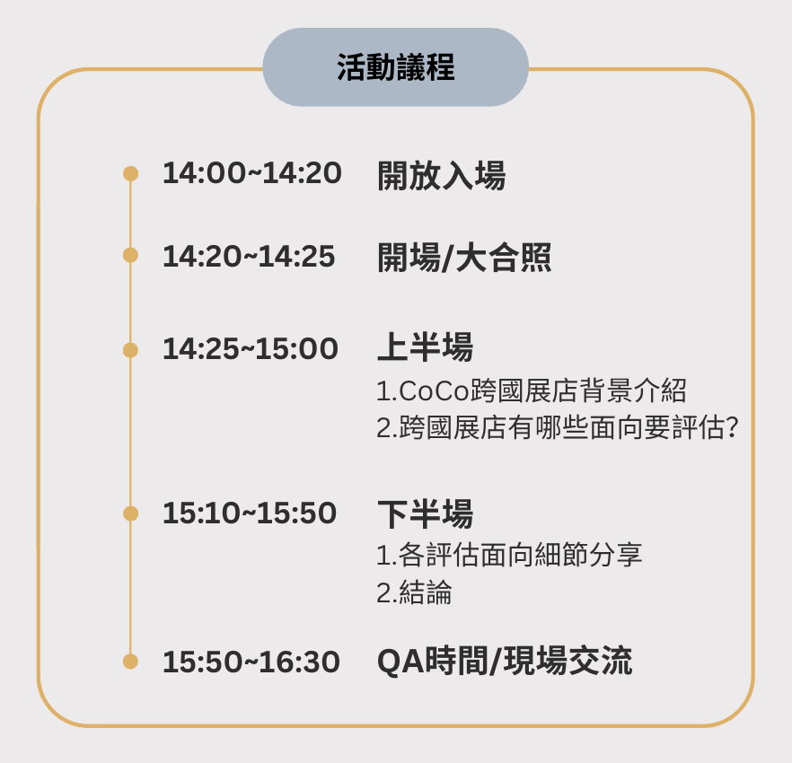 從台灣展店到國際,前期的評估面向非常多元,包含POS系統選擇、物料進出口、當地稅務法規、商品文化差異、競品差異、加盟政策...等,CoCo以自身的經驗,分享從台灣跨到國際,有哪些需要注意的細節,讓你少走點冤望路!